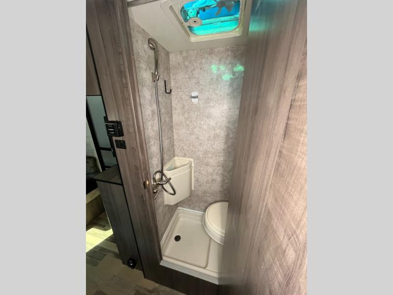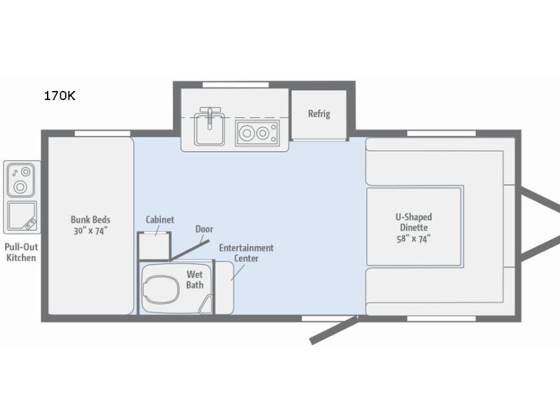 Along the curb side you will find a convenient wet bath so you can enjoy an on-board shower and toilet of your own. No running out at night in the dark to the campground bathrooms! And, right next door along the back of the unit the kids will enjoy a set of 30" x 74" bunks for sleeping, or even relaxing during the day for a bit of down time inside.