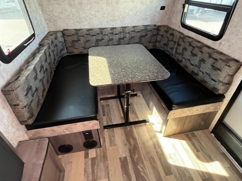 Step in and find a 58" x 74" u-shaped dinette for mealtime, or just hanging out. This also folds down and creates a bed for two adults to enjoy! There is a TV cabinet just inside the door to your left that is in perfect view from the dinette any time of the day.