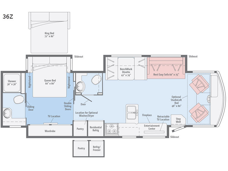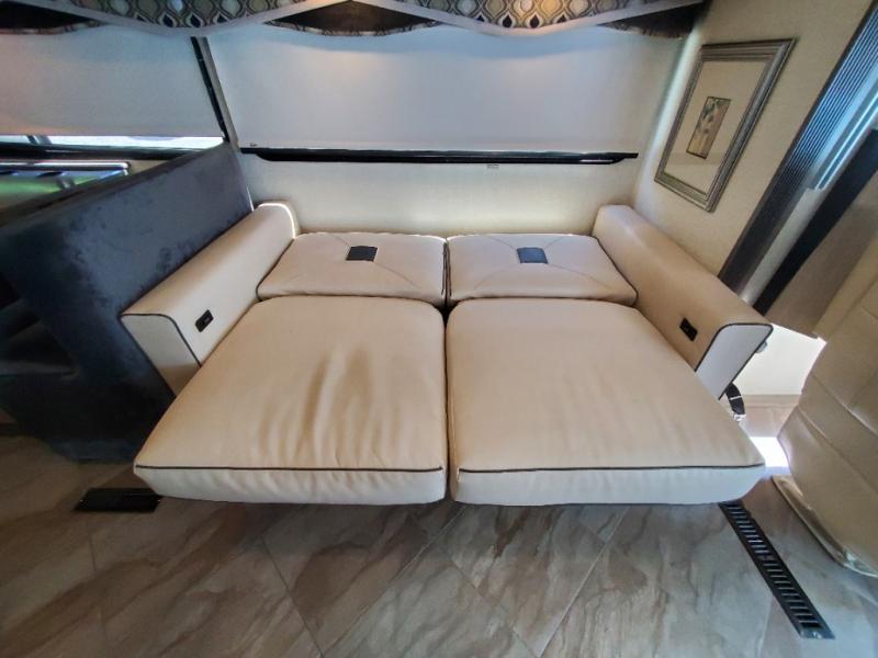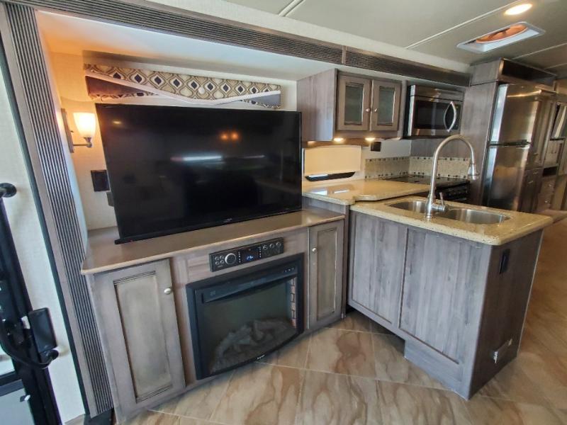 Taking this Sightseer Class A gas motorhome on the road with you will be the perfect way to spend each family vacation. Not only does the private master suite contain its own large wardrobe and 32" HDTV, but it also contains its own full bathroom making it the most luxurious space to relax in each evening. You and your family will love gathering together in the living area as you eat dinner at the booth dinette or cozy up on the rest easy sofa in front of the blazing fireplace.