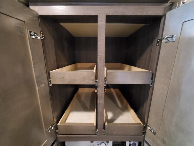 What I'd improve: We added a wall mount jewelry cabinet in the half bath for the wife. Xtra shelving in the full bath for cosmetics, etc. We added some fold up cubicle storage boxes at the foot of the bed for shoes and pots and pans. It would be nice to have a override switch for the retractable steps, I have to crawl under and unplug the connection in order to pull up to our deck and then crawl under and plug it back in when we go on a trip. Folding additional counter space would be nice.9 years ago | Frank L. from Lewistown, PA