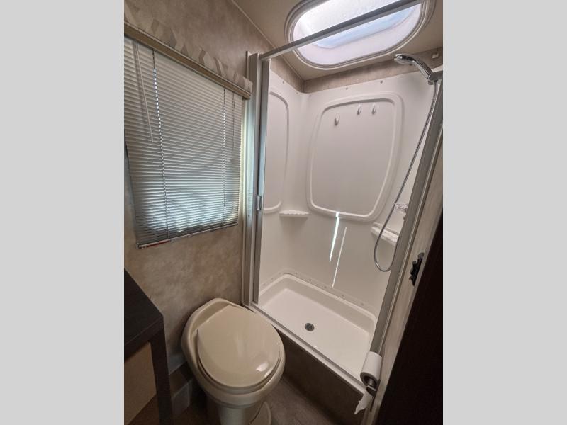 Hit the road knowing that you have all that you need at your fingertips in this Winnebago View Class C Diesel motorhome. Creating meals and snacks will be easy in the kitchen because of the two-burner range and convection microwave oven, and the Norcold double-door refrigerator/freezer will keep all of your perishable items cold and fresh. You will also find a pantry cupboard near the refrigerator for all of your dry and canned goods, and the overhead cabinets keep your daily dishes and kitchen items easily accessible. You will thoroughly enjoy the convenience of having a rear bathroom in this coach, and the Murphy bed will prove to be a huge asset in providing extra sleeping space at night while still keeping the interior free from clutter during the day.
