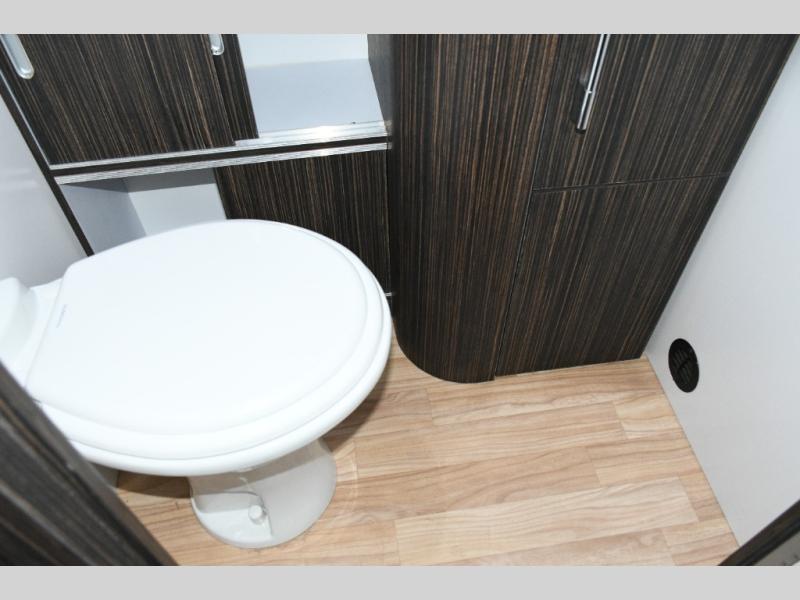 Toward the front, the semi-private bedroom features a walk-around bed, overhead storage, and its own LED TV—giving you a cozy retreat to unwind with a good movie before bed. The carefully designed split bath keeps things functional and spacious: a full shower on one side, a private toilet and sink on the other, and a large wardrobe right next door for clothing, linens, and extra gear.