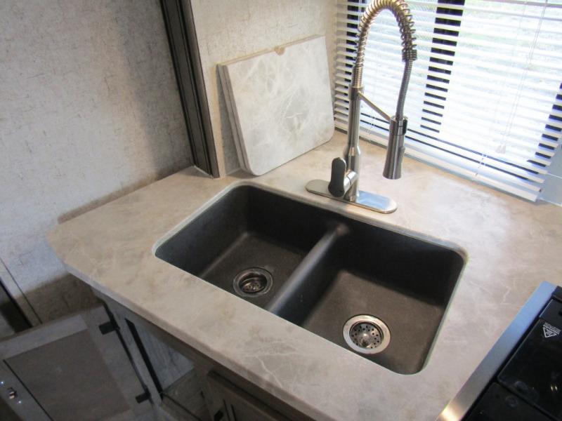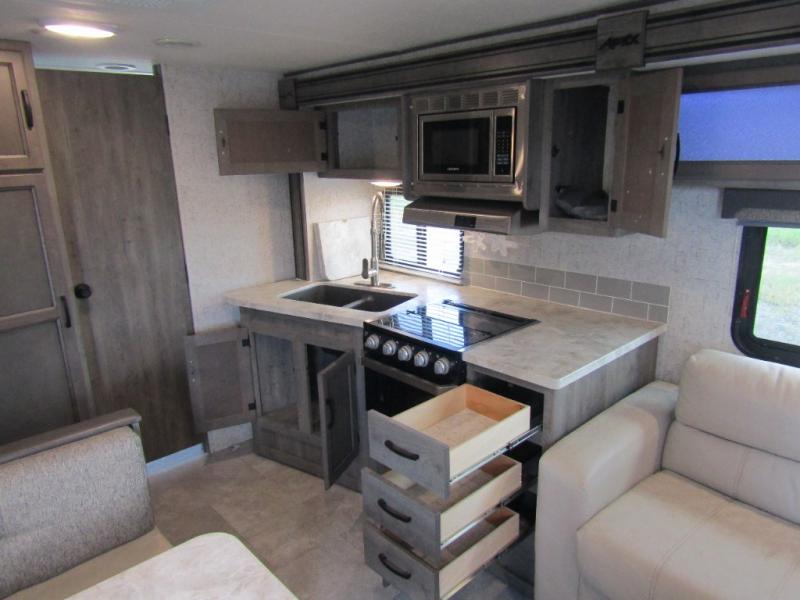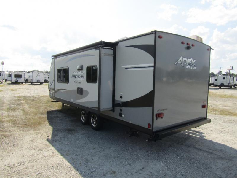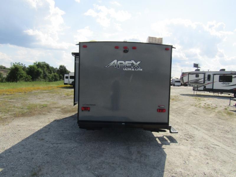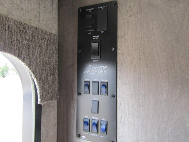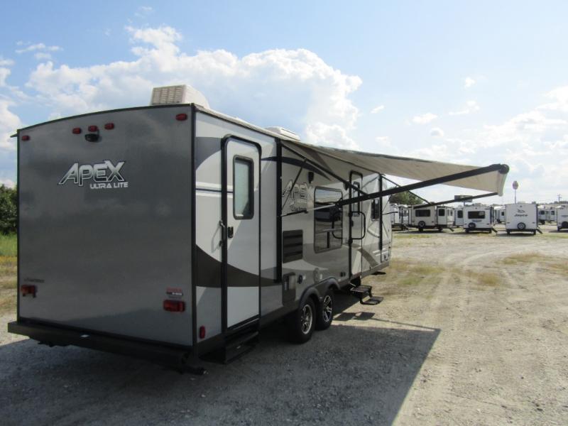 Lightweight and easy to tow, this Apex features Azdel composite sidewalls for moisture resistance and durability. Additional highlights include a power tongue jack, LED-lit electric awning, outdoor shower and speakers, pass-through storage, and prep for solar and backup camera.
