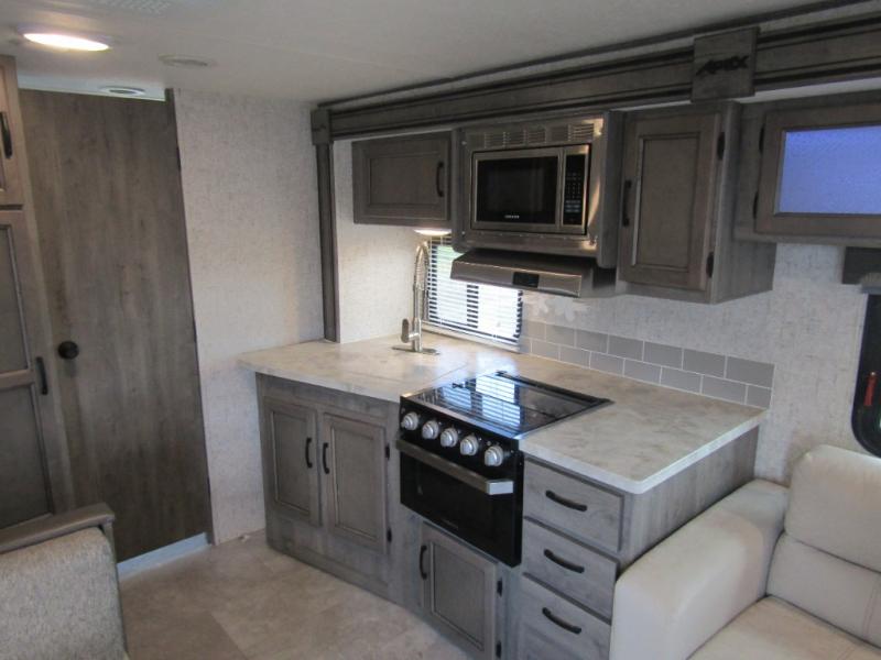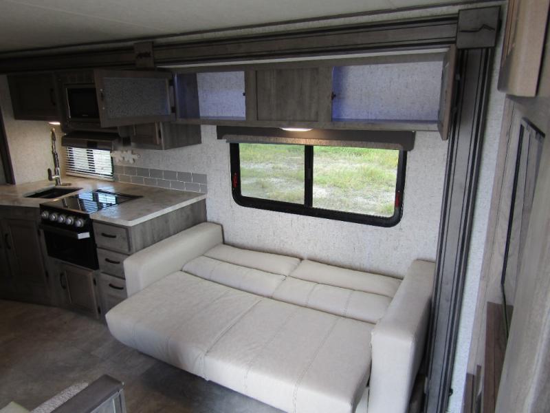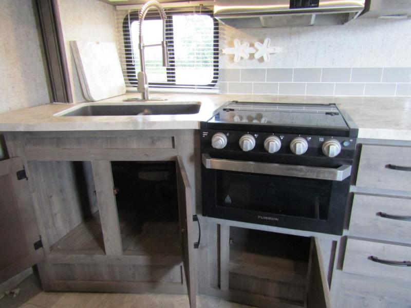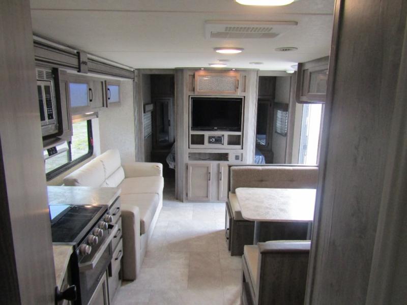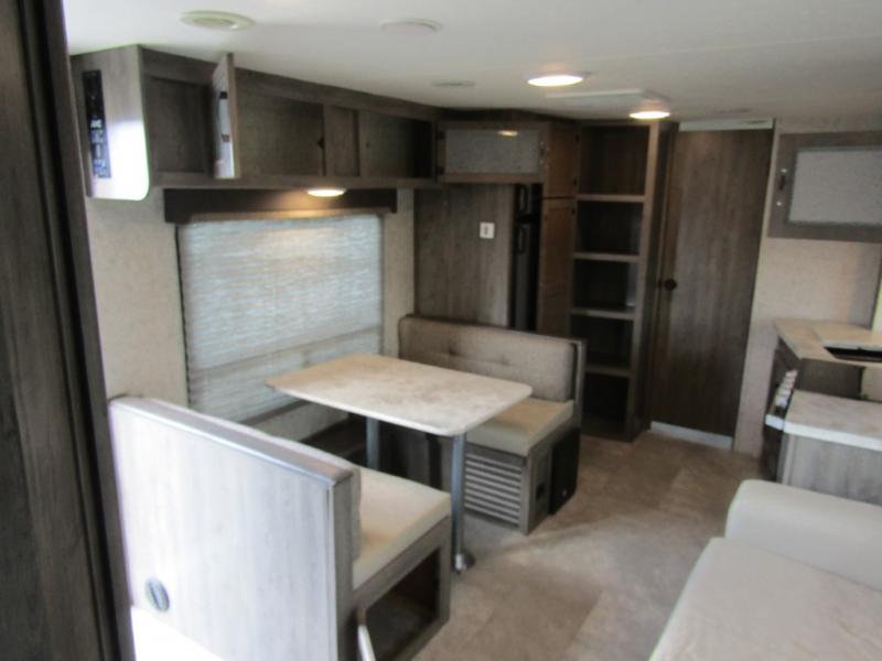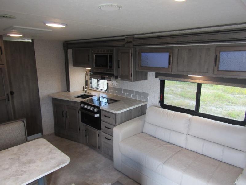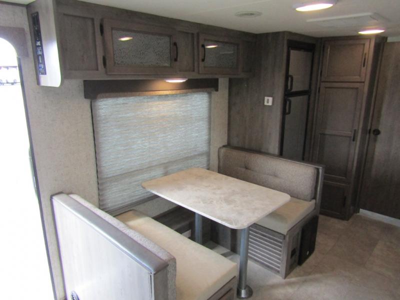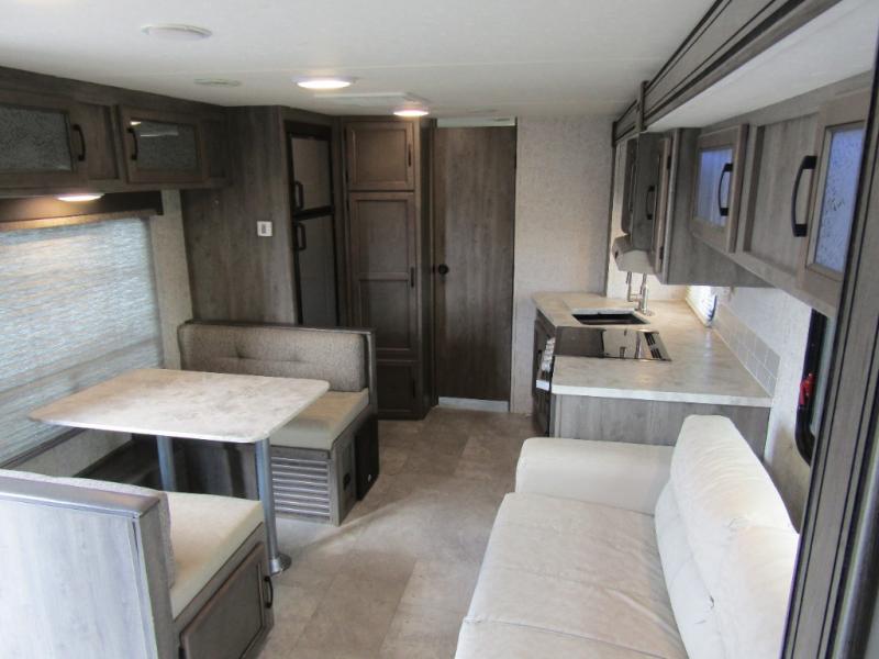 Inside, the rear full bathroom includes a corner shower, vanity, and ample linen storage, while the front private bedroom with a walk-around queen bed provides comfort and privacy. A slide-out U-shaped dinette expands the living area and converts to additional sleeping space. The kitchen is fully equipped with a 3-burner stove, oven, microwave, refrigerator, deep sink, and seamless countertops, making meal prep simple and enjoyable.