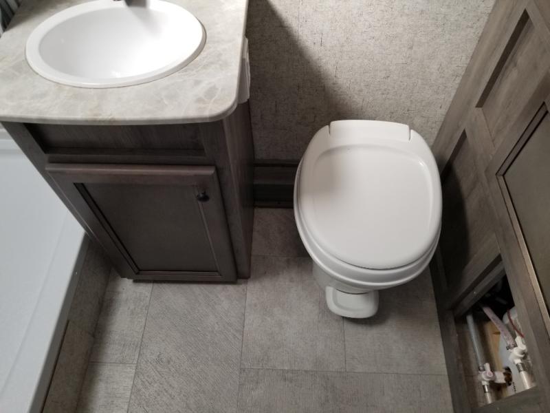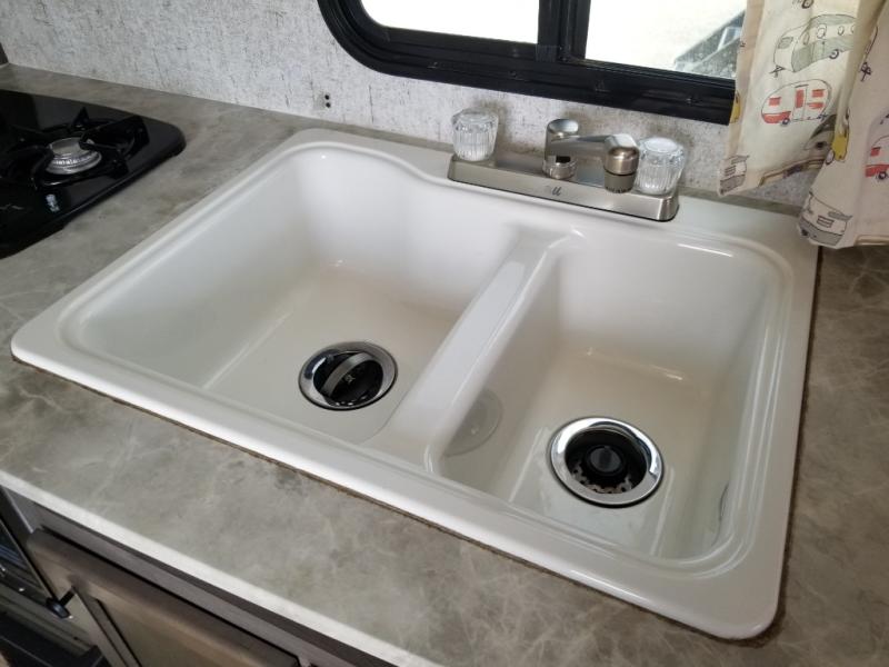 What I liked most: Quite roomy for a small camper. Plenty of storage next to the bed with 2 vertical cabinets with mirrors and 2 overhead horizontal cabinets with glass doors. Bathroom has lots of storage with 4 cabinets.