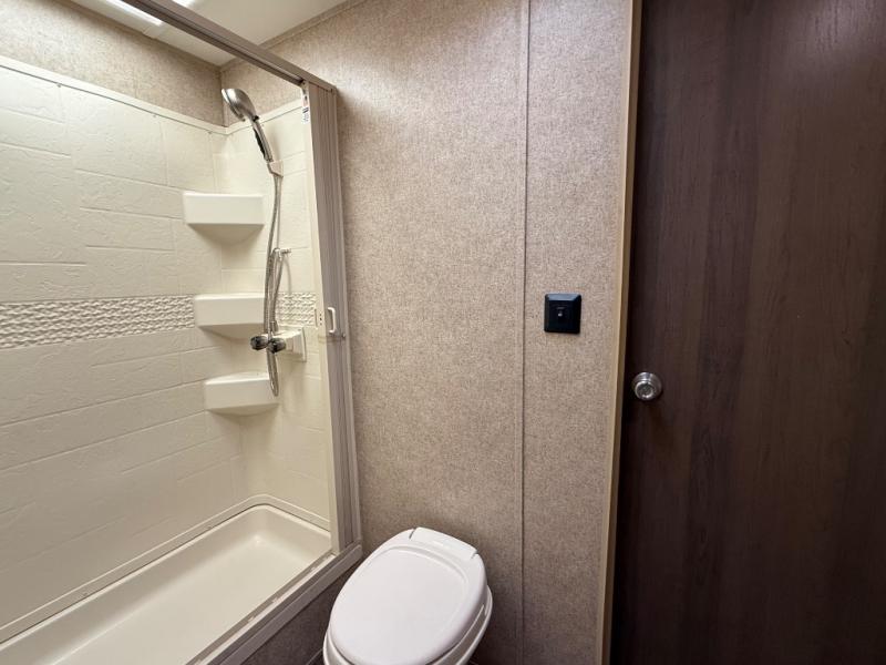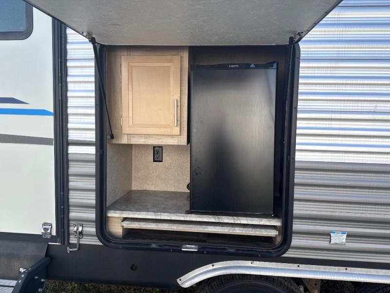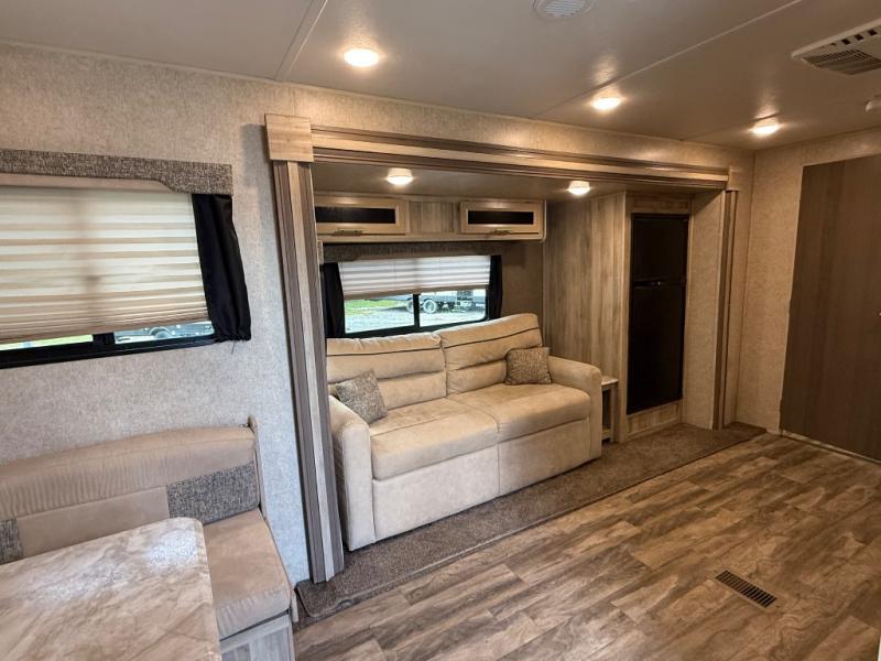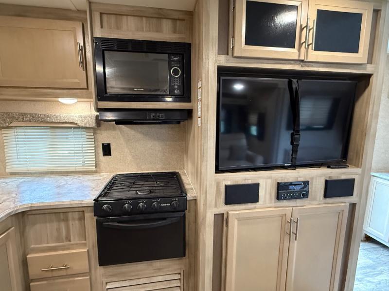 Spacious and perfect for entertaining overnight guests is exactly what you will get with this model. The outside kitchen beneath an 18' awning makes it easy to entertain family and friends all while enjoying your surroundings and the fresh outdoor air. If anyone wishes to stay the night the tri-fold sofa and booth dinette will make comfortable sleeping accommodations. The walk-through bath is also quite spacious featuring an entry from either the living area or front private bedroom. With overhead cabinets throughout, plus a pantry and bedroom wardrobes, there is ample storage for your things inside and outside. Check it out today!