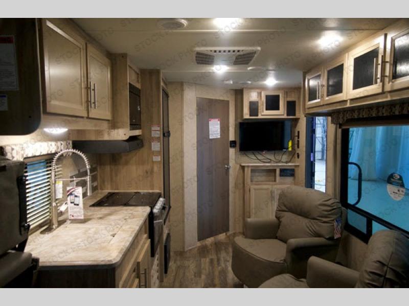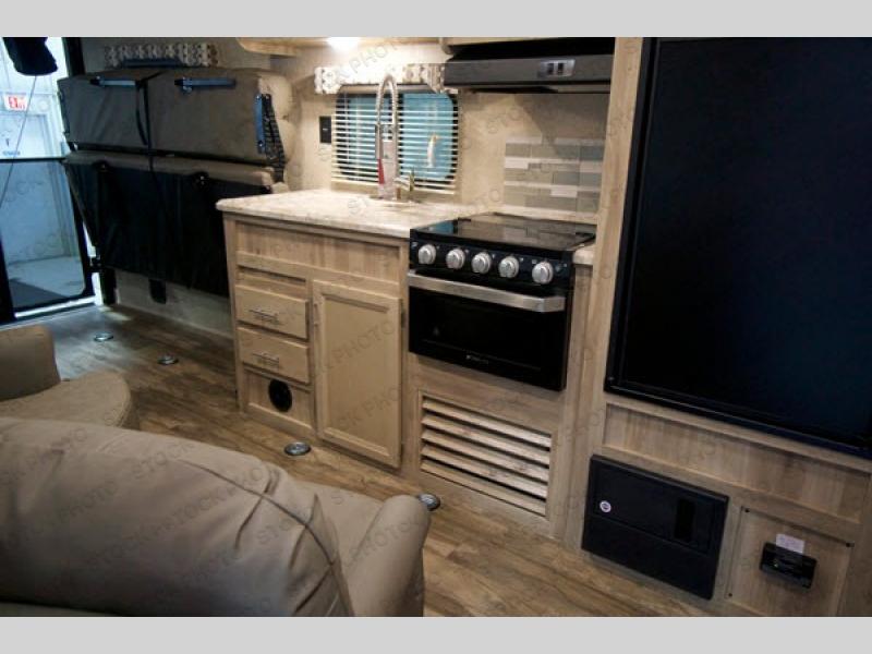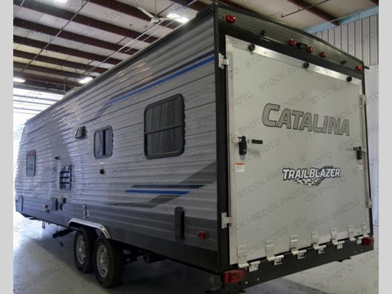 You will love blazing your own trails with the toys you pack inside this Catalina Trail Blazer toy hauler model 26TH. You will love how easy it is to load and unload using the 90" x 74" rear ramp door. If you choose the optional party deck package available then you can create a raised outdoor living space to enjoy when you come in from a fun day of riding or playing. When nightfall arrives, you can fold down the sofa and create added sleeping space for family members or a few added friends. There are also overhead cabinets for your daily dishes and other kitchen items. You will have no trouble whipping up meals and snacks in the fully equipped kitchen to stay fueled for more fun. On the outside, a 15' power awning is great for creating a protected outdoor living space from the wind, sun, and rain. There is also exterior storage in front for all of your outdoor camping gear too!
