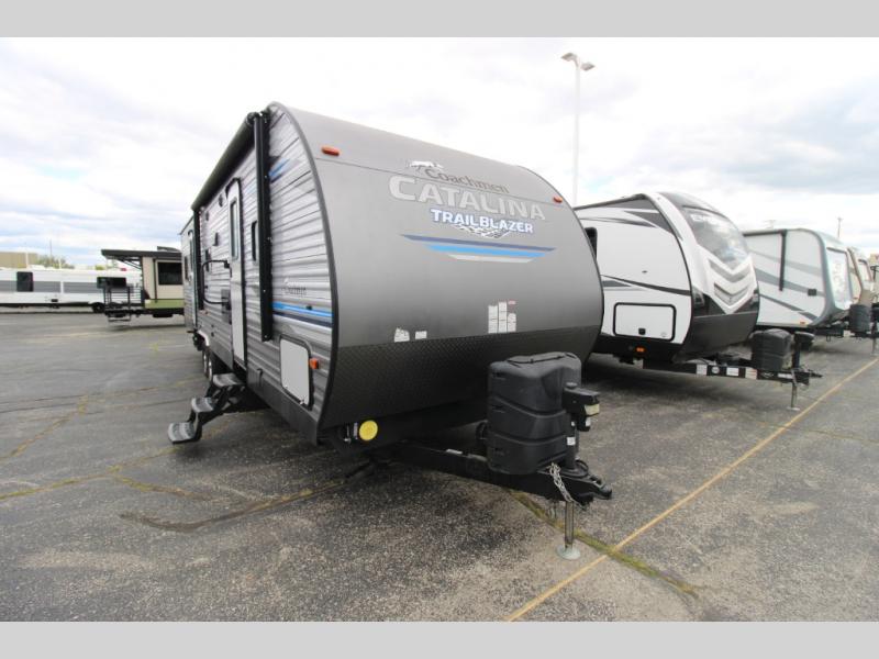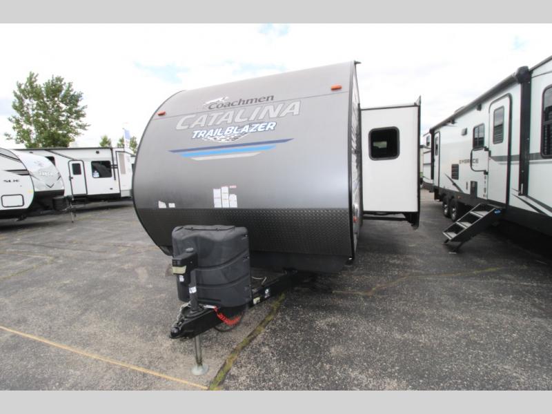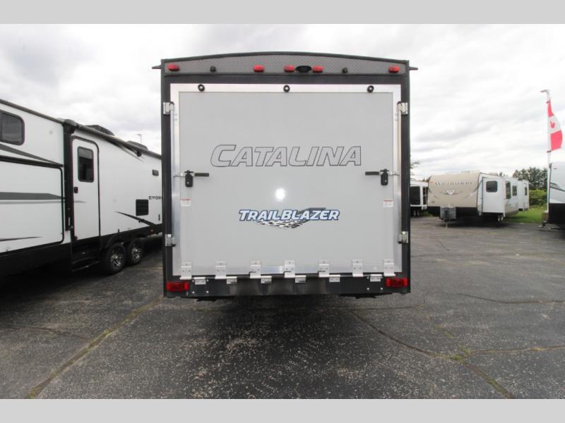 Coachmen RV has done it again with the Catalina Trail Blazer's! These toy hauler travel trailers each have a large ramp door for easy loading and unloading of your toys, plus there is a Toy Lok system that helps to keep everything in place. The exterior utility shower is super helpful after a long day of mudding, which means you can rinse off before dragging mud throughout the trailer. There is also a front diamond plate, back-up camera prep, and a fully enclosed underbelly to ensure safety as you travel. Inside you will love all of the at home features like the LED lighting, the residential pull down faucet to make your clean up easier, and the Furrion DVD/mp3/FM Stereo w/ Bluetooth and USB Charging Port, plus there is an upgraded in-wall speaker system. So, come check out the Coachmen Catalina Trail Blazer toy hauler that best suits you!