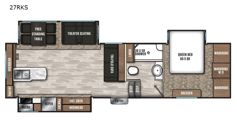 If you're looking for a luxurious fifth wheel to take you on a camping trip while still providing you with the comforts of home, then check out this Coachmen Chaparral 27RKS! It features a front private bedroom with a queen bed for you to enjoy a good night's rest, along with a large dresser, and three wardrobe closets, one of which is prepped to add the optional washer and dryer. You can bring along all of your favorite camping goodies and easily store them inside one of the two pantries in the kitchen and enjoy them at either the free standing dinette, the theater seats with cup holders available, or the tri-fold sofa. When you want some fresh air but don't want to get sunburned then grab a chair and your favorite drink, and head underneath the 15' electric awning with LED lights so that you can enjoy time out there whether day or night!