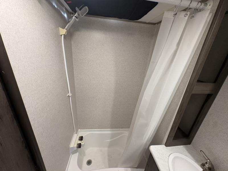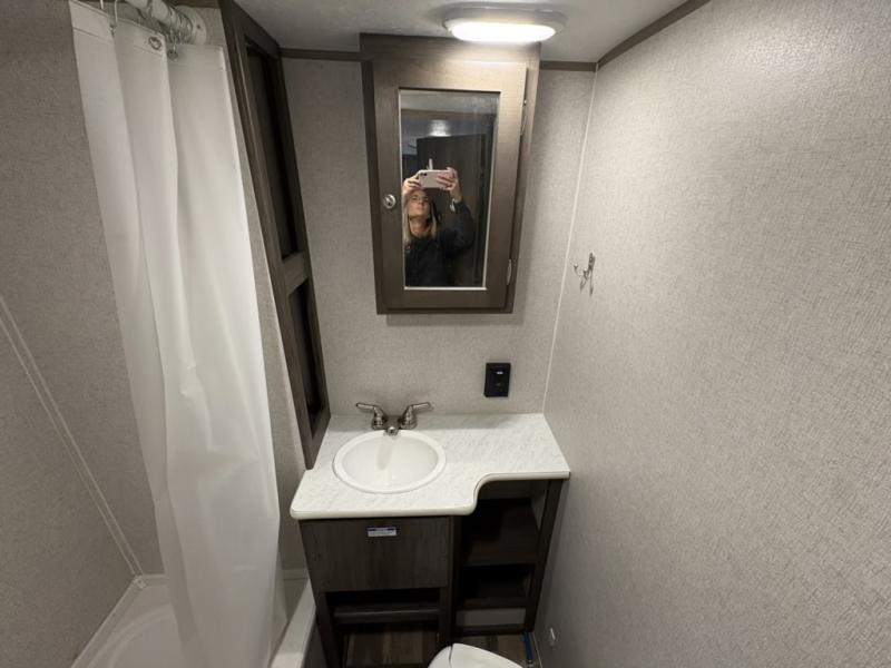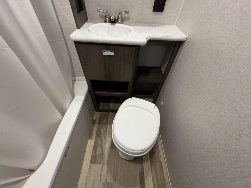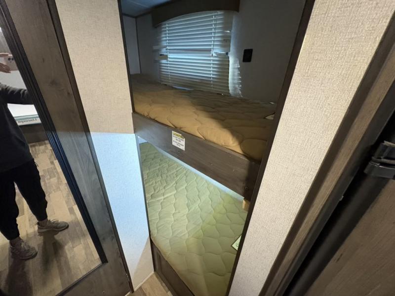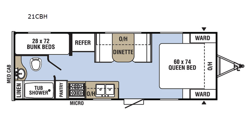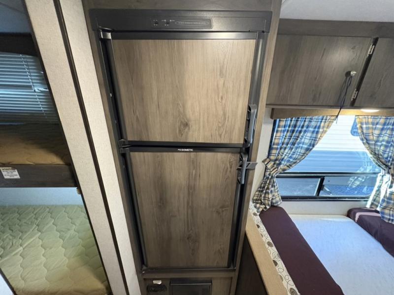 This unit is perfect for a family of four to five that enjoys inside comforts after venturing outdoors! Just imagine cooking on a three burner range or with the microwave, and storing plenty of food in the refrigerator and pantry for a week-long stay. You will surely appreciate your own full bathroom to be able to take a bath or shower before bedtime as well as store towels in the linen cabinet. You can sleep on a queen bed, a set of bunks beds or even on the dinette if needed. The campground is waiting for you!
