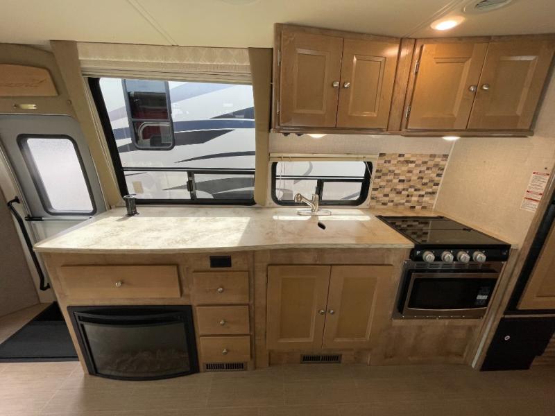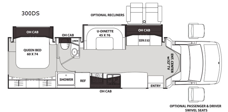 Step inside this Concord 300DS Ford motorhome for a spacious and relaxing trip to your local state park or even across the country. The large slide out in the living area allows everyone to stretch out and here you'll find a u-shaped dinette and a sofa that can both be converted to additional sleeping space, which allows this unit to sleep six people comfortably. After traveling to your destination all day, the chef of the family can prepare a meal on the three burner cooktop while the kids watch a movie on the 32" TV! Mom and dad will love the walk-through bath that leads to the rear private bedroom with a slide out queen bed for a great night's rest.