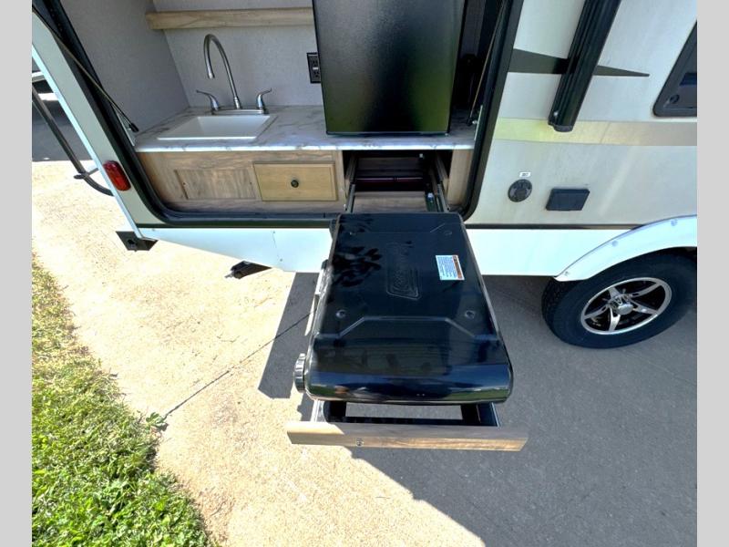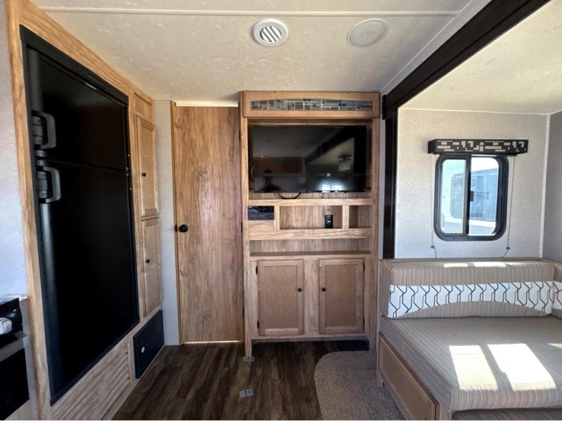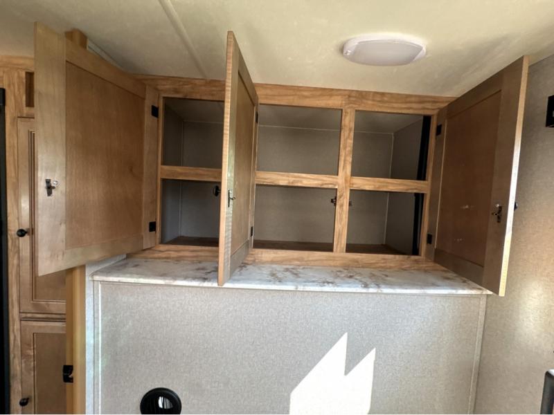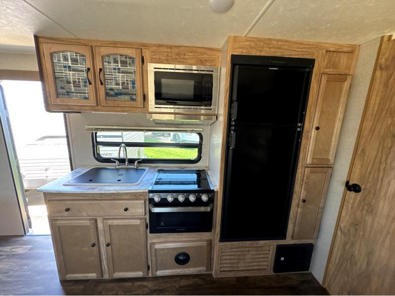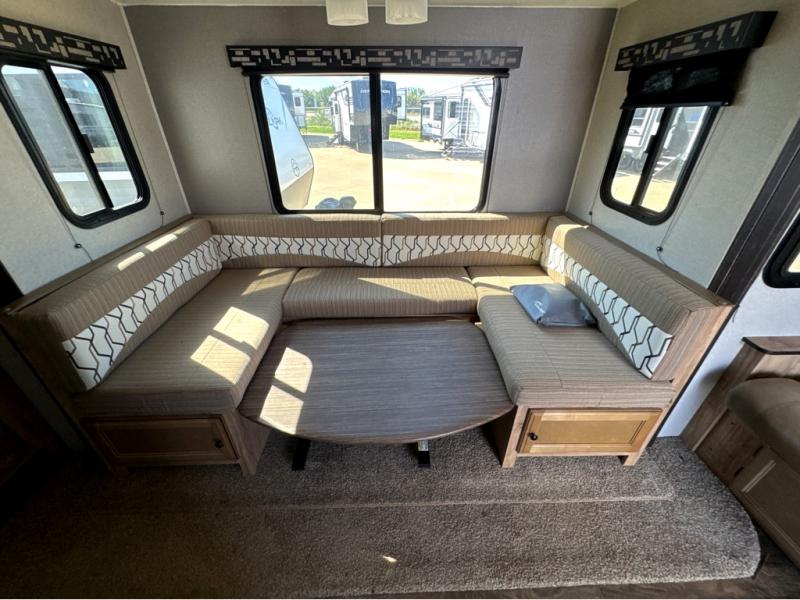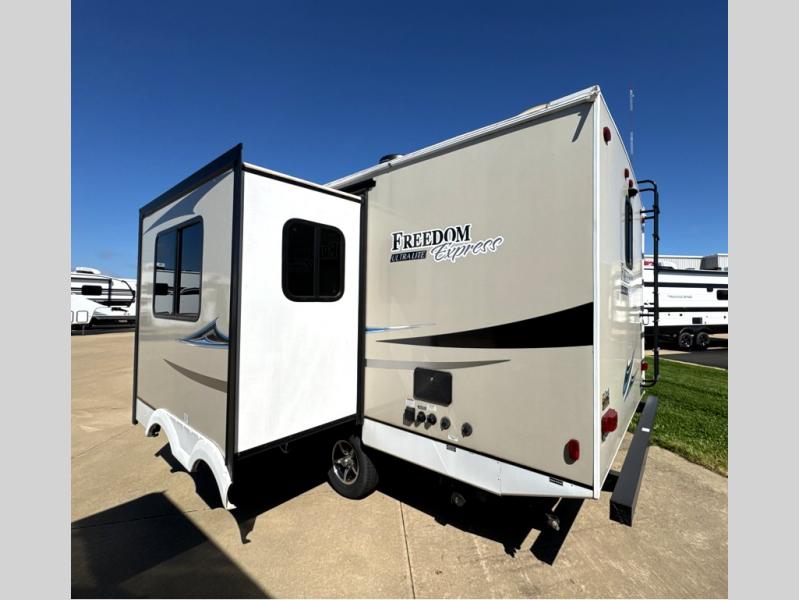 This Freedom Express Ultra Lite travel trailer allows you to relax like you do at home with more interior space thanks to the slide out in the living area. You'll appreciate the front private bedroom with a queen bed and wardrobes for your clothes. The kids can make their beds either on the U-shaped dinette or the sofa once folded down for the night. This unit features a full rear bath with a 32" radius shower and a linen closet for towels. If you enjoy cooking outdoors, then imagine making dinner for everyone at the outdoor camp kitchen!