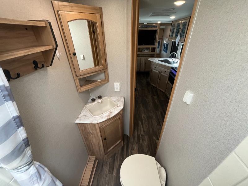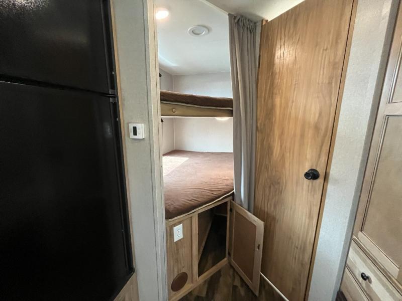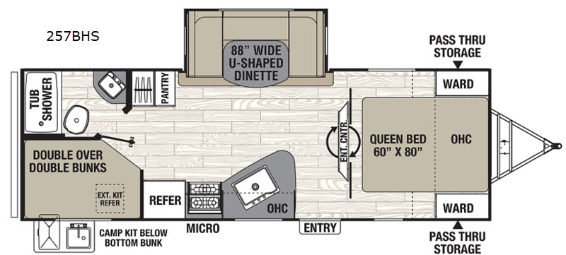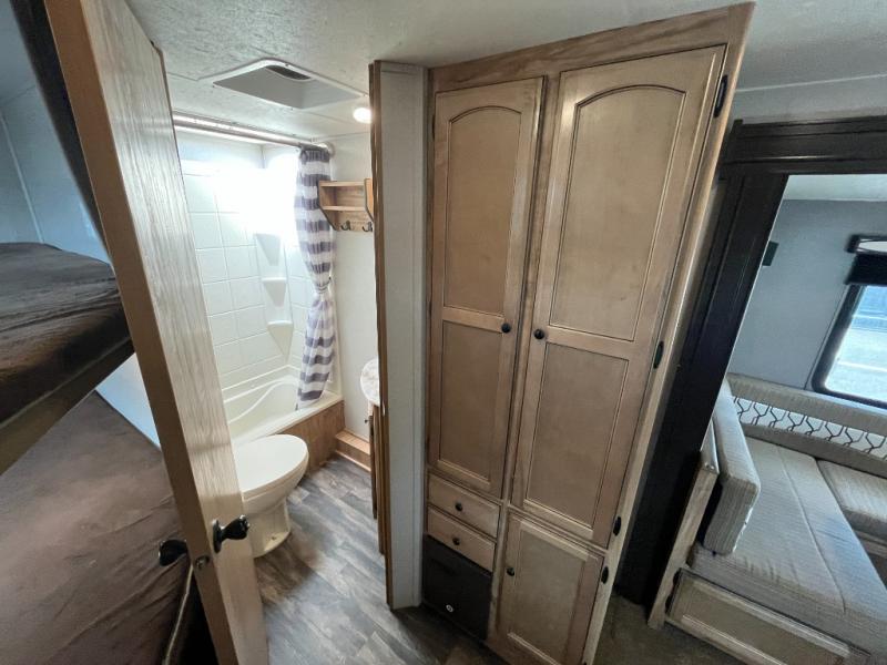 You can dine, play games, and sleep in this this travel trailer that will comfortably fit your family of eight perfectly. The front private bedroom includes a queen bed, plus wardrobes for your shoes and clothes. The kids will love the double bunk beds and with the rear corner bath right next to the bunks, it will be easy for them to use the restroom at night. Enjoy a game of cards around the 88" wide u-shaped dinette, or take the removable resin outdoor table outside to enjoy some fresh air. The chef of the family can prepare dinner on the outside camp kitchen and everyone can enjoy the electric awning with LED lights!