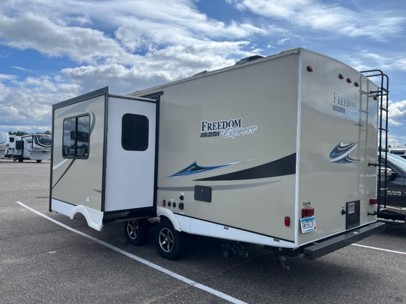 With any Freedom Express Ultra Lite travel trailer by Coachmen you will appreciate of ease of towing behind your family vehicle. All the tanks are located under the floor to lower the center of gravity for increased storage capacity and improved handling down the road. Inside, you'll enjoy features such as, LED lighting throughout, Congoleum Designer Carefree Flooring, an LED TV, plus a 6 cu.ft. double door refrigerator to name a few. The pass through storage with an LED light strip allows you to easily bring along those larger camping items, plus there is an electric awning with LED lights outdoors as well as an exterior shower station to wash off your hiking boots. Come see how you have the freedom to explore in a Freedom Express Ultra Lite travel trailer today!
