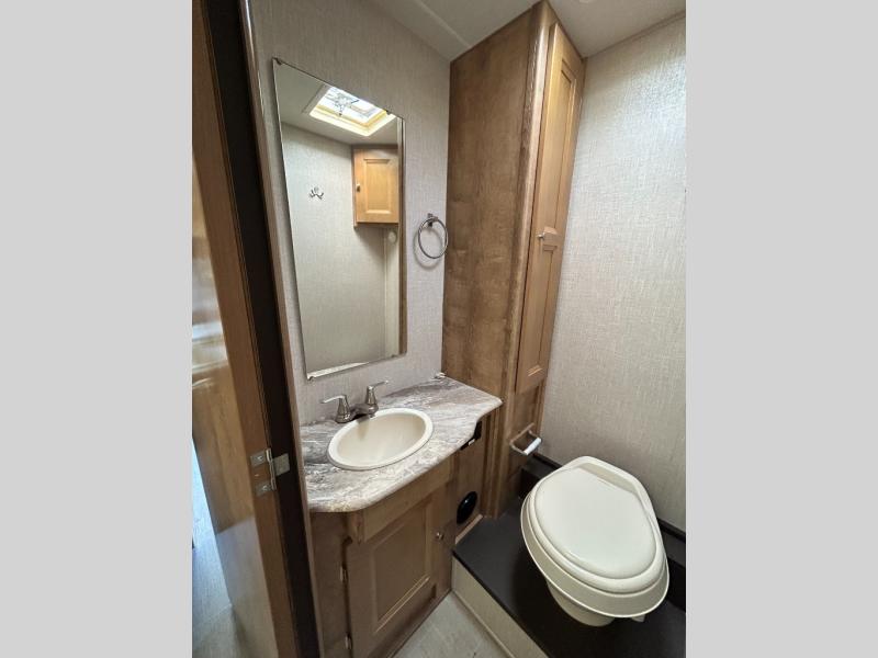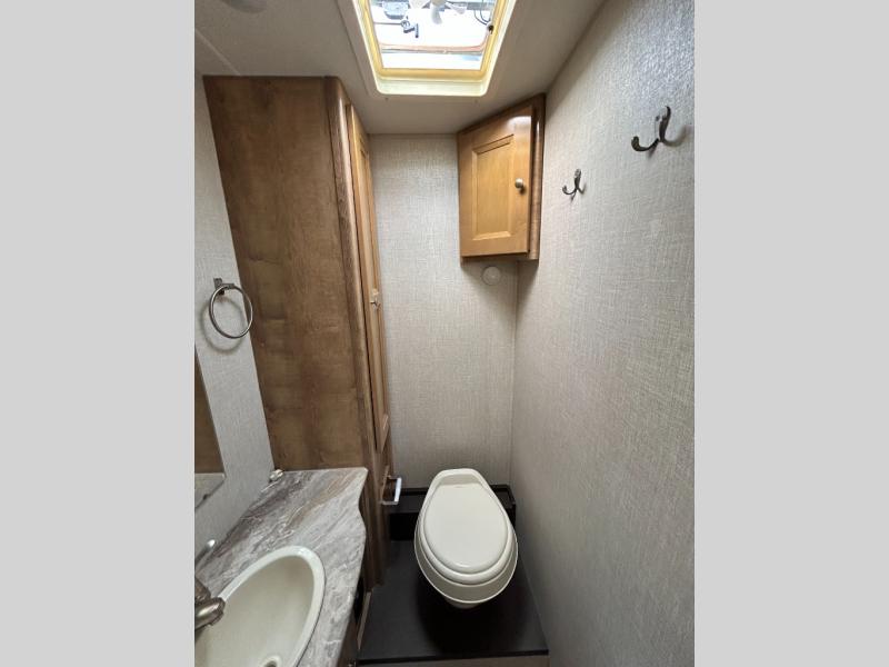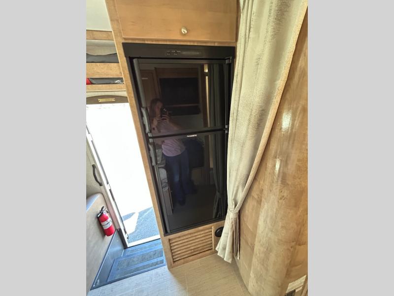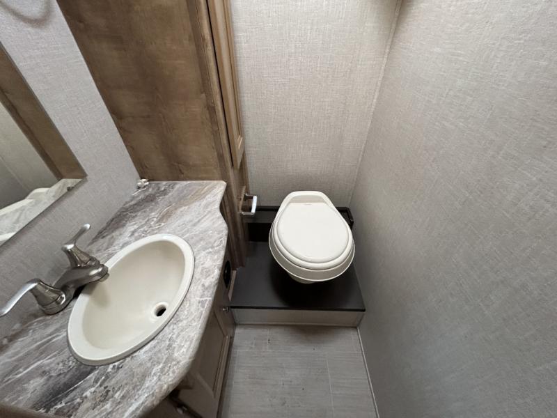 Looking for privacy when sleeping and getting dressed in your next coach? This unit offers a private rear bedroom with a walk-around queen bed, a bunk over the cab for the kids, and furniture that doubles as sleeping accommodations for guests. The split bath is great, having the toilet separate from the shower is super convenient. The entry door is almost mid-coach which is kind of unique, and you don't have to go through the cab area to get inside. Your family will love having a sofa and a booth dinette for relaxing, eating meals, playing games, or enjoying one another's company throughout your trip.