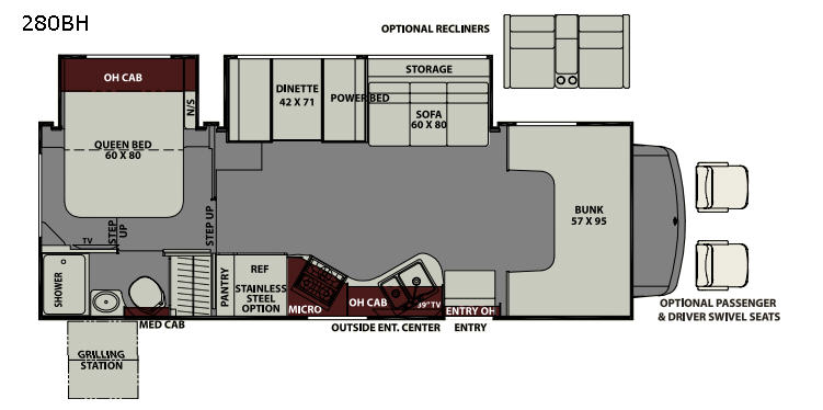 Travel comfortably with family and friends enjoying a great time on your next road trip with this Leprechaun 280BH as your home base. This unit easily sleeps 8 with the use of the sofa and power salon style bunk that drops down over the dinette and sofa. There is also comfortable sleeping in the rear private bedroom featuring a queen bed slide out as well as up on the 57" x 95" over cab bunk. This makes it easy for your larger family to be comfortable, or the kids can bring along a friend or two. When it comes to relaxing there is plenty of seating for everyone inside, and an outdoor entertainment center allows you to enjoy even television watching outside.
