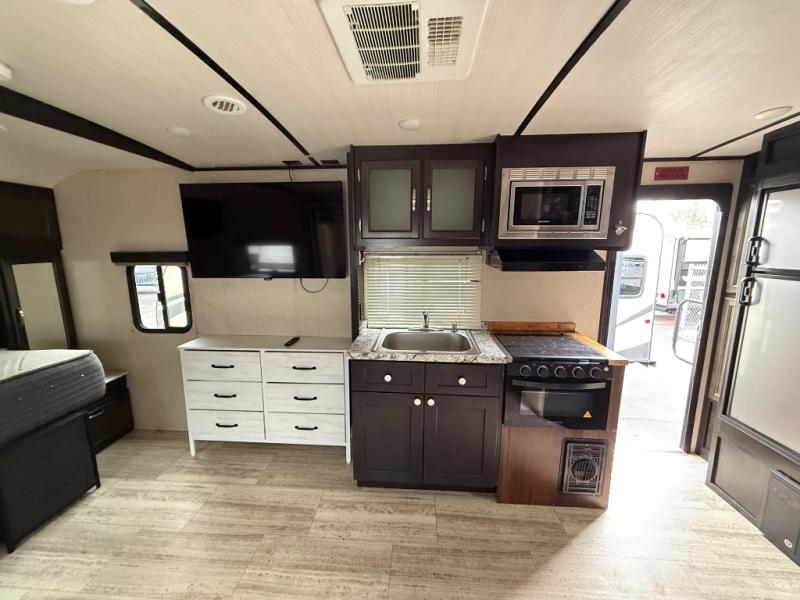Take this Spirit Ultra Lite travel trailer with you on your next adventure and enjoy the freedom you have to explore comfortably! The full kitchen with its three-burner range top and stainless steel microwave will be extremely helpful each morning as you prepare a batch of pancakes and a pan of bacon. You will be grateful for the radius shower in the full bathroom so that you can easily get cleaned up and prepared for the day ahead. The sofa slide is convenient because it extends out which means that you have more interior living space, and the two end tables will be perfect for holding drinks and snacks as you sit and relax on the sofa.