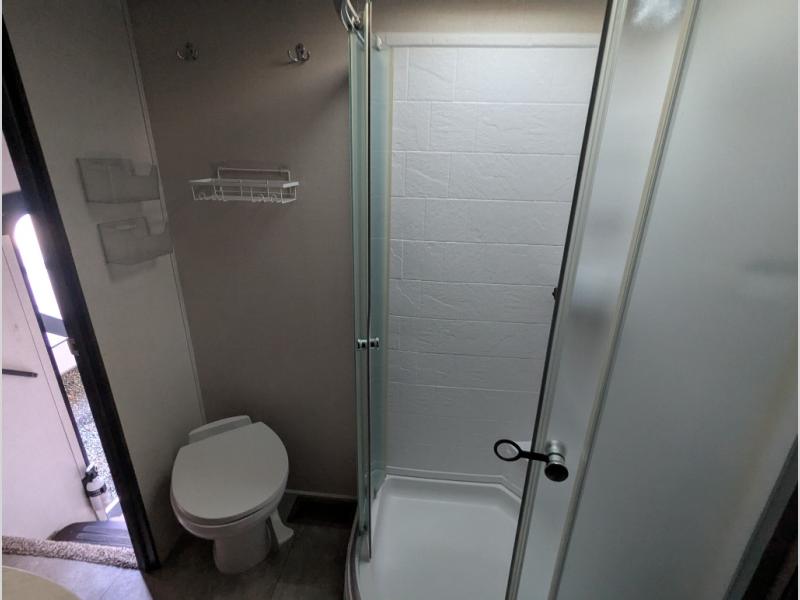 For just about any camping trip you will want this Cruiser Aire CR29SI in tow! There is so much room inside with the dual opposing slide outs in the kitchen/living area. Meal prep is easier than ever with the kitchen island, which you will find a high rise faucet with a pull-out spray hose, plus extra counter and storage space. At the top of the stairs there is a private front bedroom with a residential queen bed with overhead cabinets and a spacious closet for you to bring along your whole wardrobe. In the evening plan to grab your favorite drink and sit back at either the theater seating with cup holders or the 72" sofa with night stands on either side.