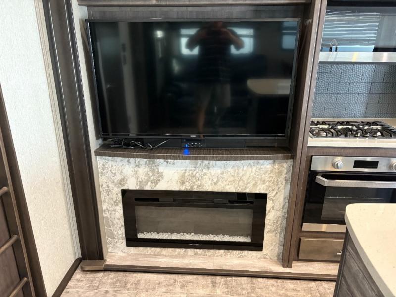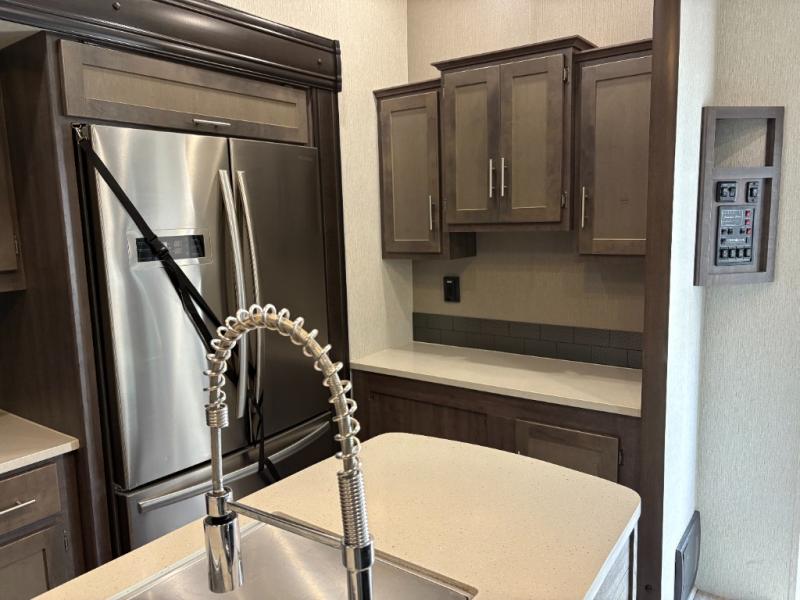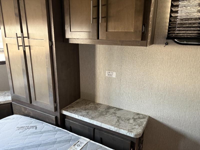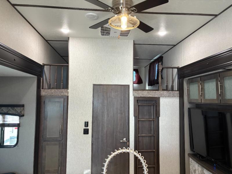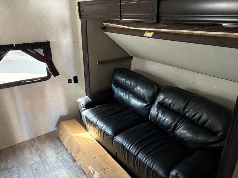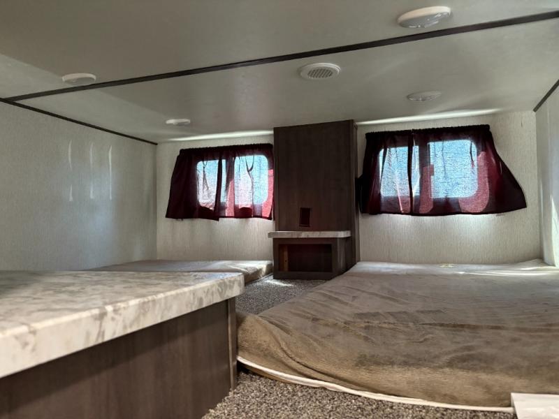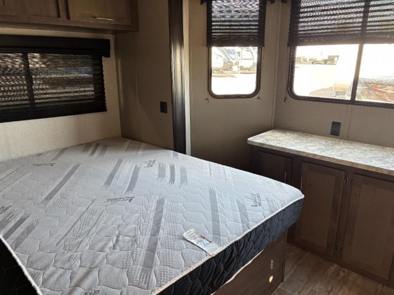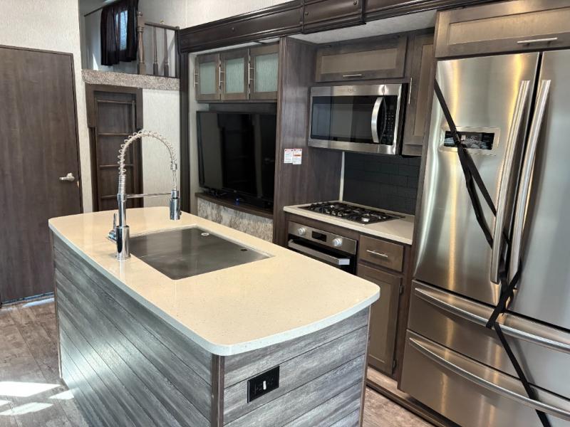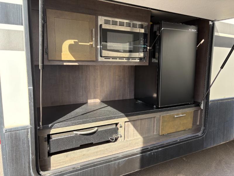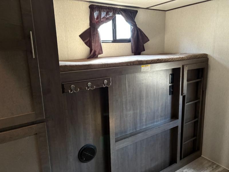 You don't have to sacrifice a thing when you are at the lake, in hill country, or enjoying your morning coffee from your land. If you are alone or the whole family joined you on this trip, you will find the rear private bunkhouse and the front private bedroom allow you to separate the sleeping space each night. And the overhead loft is an exceptional addition for the kids or grandkids to enjoy, or a place to store a few items out of the way. You will be amazed at how easy it will be to prepare each day's meals with the many different kitchen amenities, such as the 21 cubic foot stainless steel refrigerator, the 22" microwave, and the pull-out faucet sprayer in the sink.