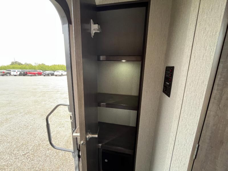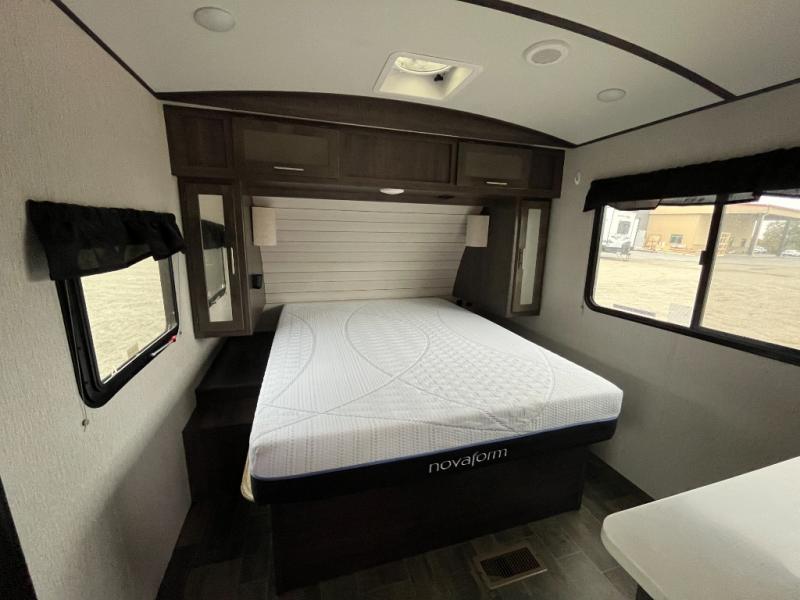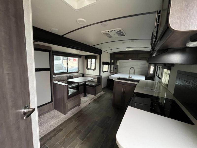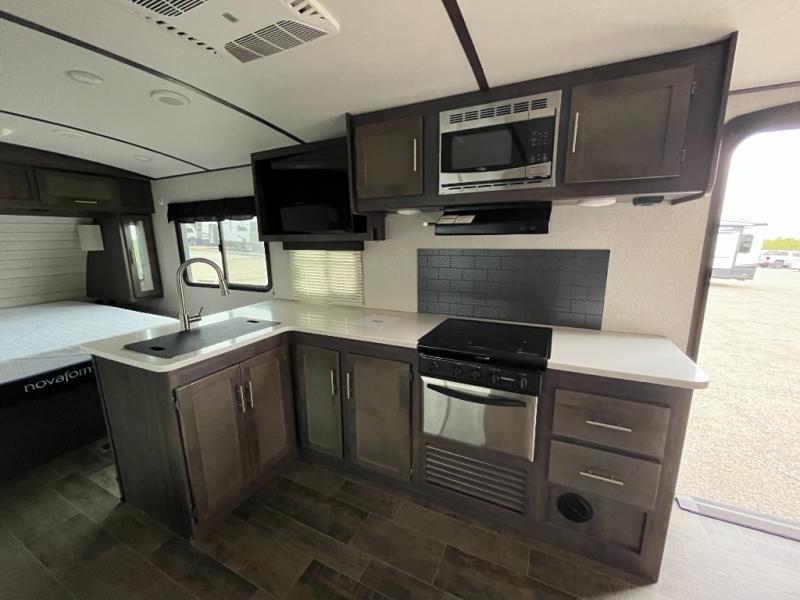 The exterior of the CrossRoads Sunset Trail Super Lite travel trailer is completely sleek and modern looking with its tinted windows that help protect your interior decor from fading and its painted fiberglass front cap that curves over to the roof and delivers a more aerodynamic approach. However, you will enjoy spending your evenings outside of the Sunset Trail for more reasons than just the appealing exterior vibe because each unit comes equipped with an electric awning with LED lights and outdoor speakers which create the perfect place to host a late-night get together with friends.