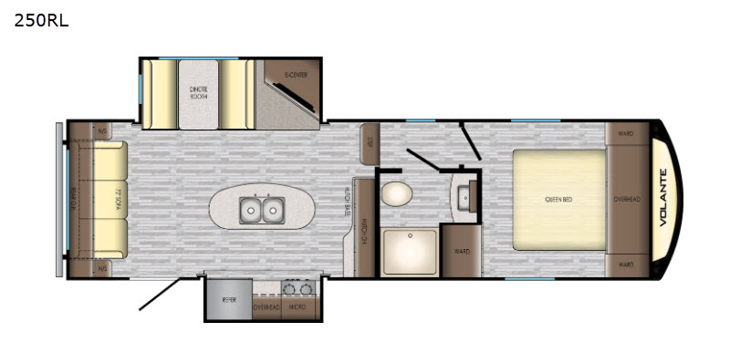 Get ready to do a little entertaining and a whole lot of relaxing when you choose to camp with this double-slide Volante fifth wheel. In the rear living area you will find plenty of seating with the 72" sofa and booth dinette that will allow you to enjoy your meals, play a card game, or sleep peacefully at night. The kitchen has all of the amenities that you would expect to find at home, plus an island with a double sink, and at night you can head to the private bedroom where you will find a queen-size bed and plenty of storage for all of your clothes.