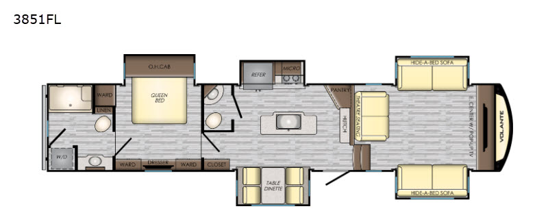 Get ready to make plenty of memories camping with your family in this Volante fifth wheel. The front separate living room features an entertainment center with a fireplace along the front wall, dual opposing hide-a-bed sofas, and theater seating making it the perfect place to watch the big game. The kitchen is another gathering spot for family and friends with its free-standing table with chairs and large island. In the rear master suite is where you will find a spacious bathroom that contains a closet for a washer/dryer so that you can keep up with your laundry even wile away from home.