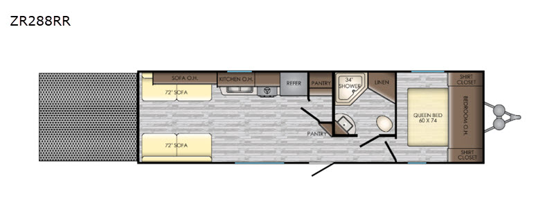 When the riding trails are calling your name, load up a few dirt bikes or a four wheeler and set out to the campground of your choice with this Zinger toy hauler travel trailer by CrossRoads RV. After your gear is unloaded, you can set up the two 72" sofas for a nice living area. The fully equipped kitchen is easy to use, plus there is a large pantry for your canned/dry goods. Almost straight in from the door is the full bathroom that has a 34" neo-angled shower, and in the private bedroom you will find a queen-size bed.