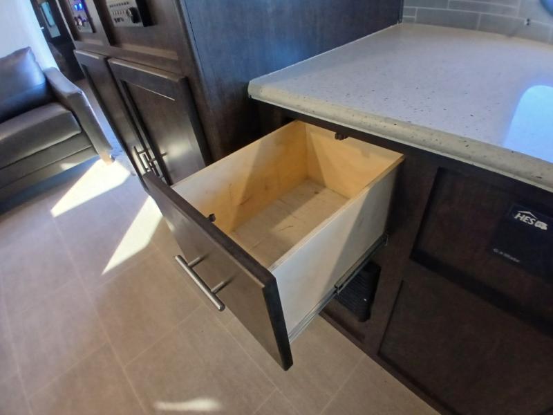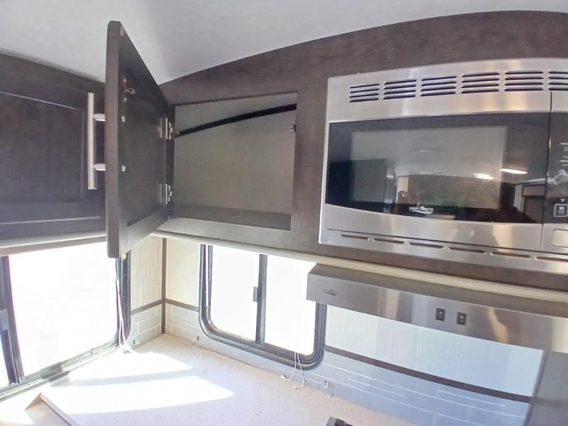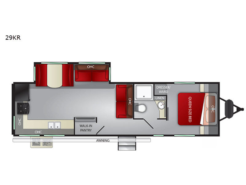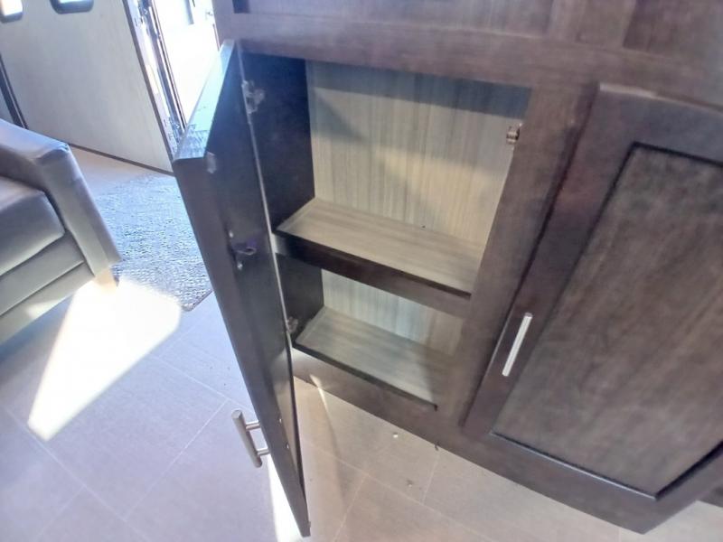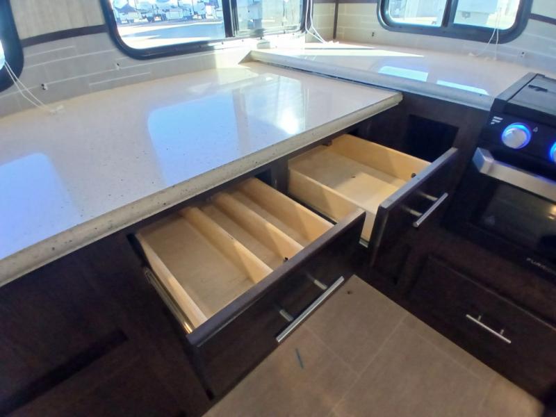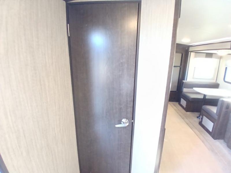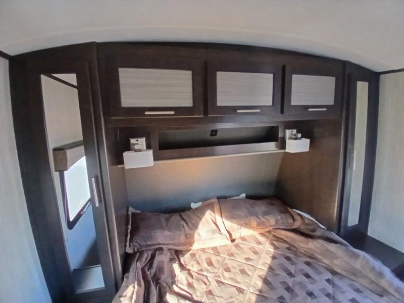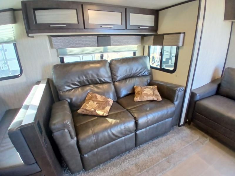 The chef in the family will love this kitchen layout along the rear wall and side wall giving them extra counter space to make their favorite meals and desserts for when guests visit. And the walk-in pantry will allow them to stock up on everything they might need. You will also find it easy to host your family and friends during the day and overnight with the booth dinette and two sofas that have been included in the main living area, and when it is time for bed, nothing will feel better than retreating to your very own queen bed for the night as you slide the space savings door closed.