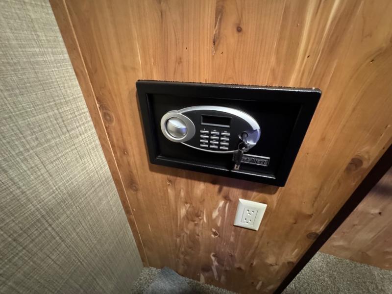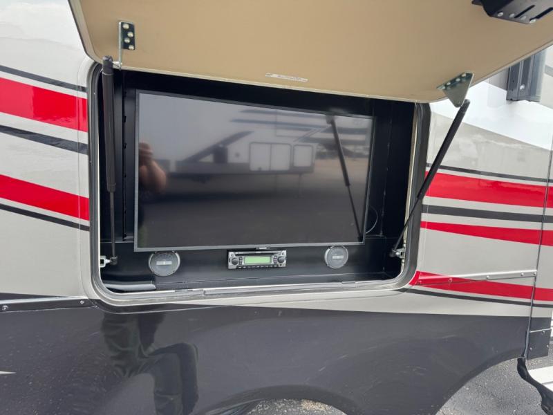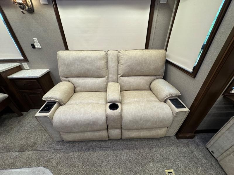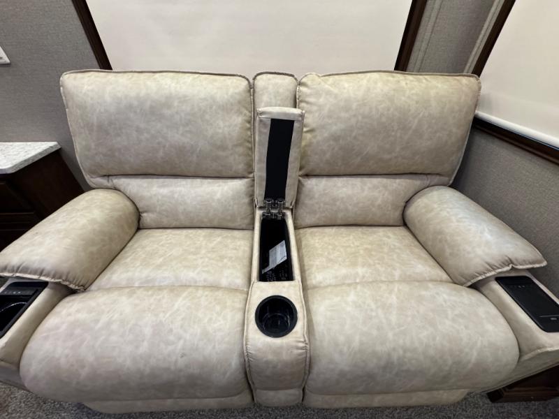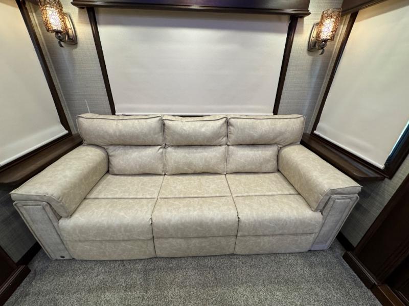 You are going to love traveling in this DRV Suites Elite Suites fifth wheel model 39 DBRS3. This unit features triple slide outs for added interior space, a kitchen island, and one and a half baths with one of them being a front master bath including a double vanity sink! Your meal prep and clean up will be a breeze with the kitchen island providing extra counter space and a double deep bowl stainless steel sink with sink covers. When you're ready to wind down your night, you can choose to either head into the private bedroom and relax on the king bed or keep the night going by socializing in the rear living area. Where you will find enough seating for everyone with the sofa and theater seating which has cup holders to hold your favorite beverage, plus there is a 55" smart HDTV to watch your favorite movies!