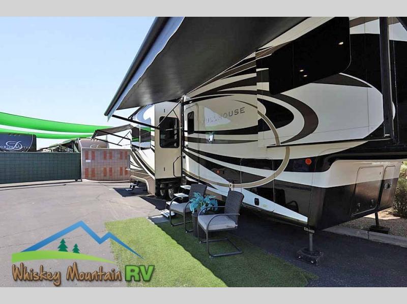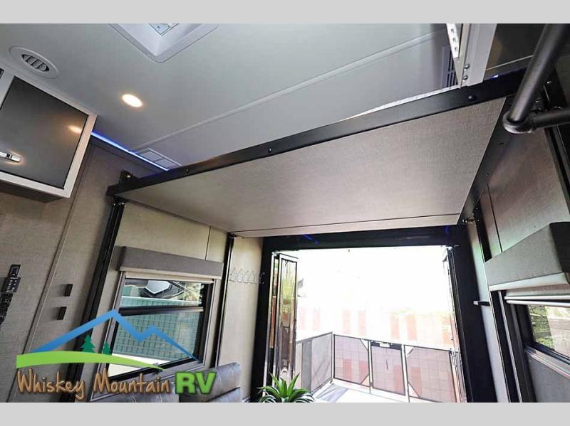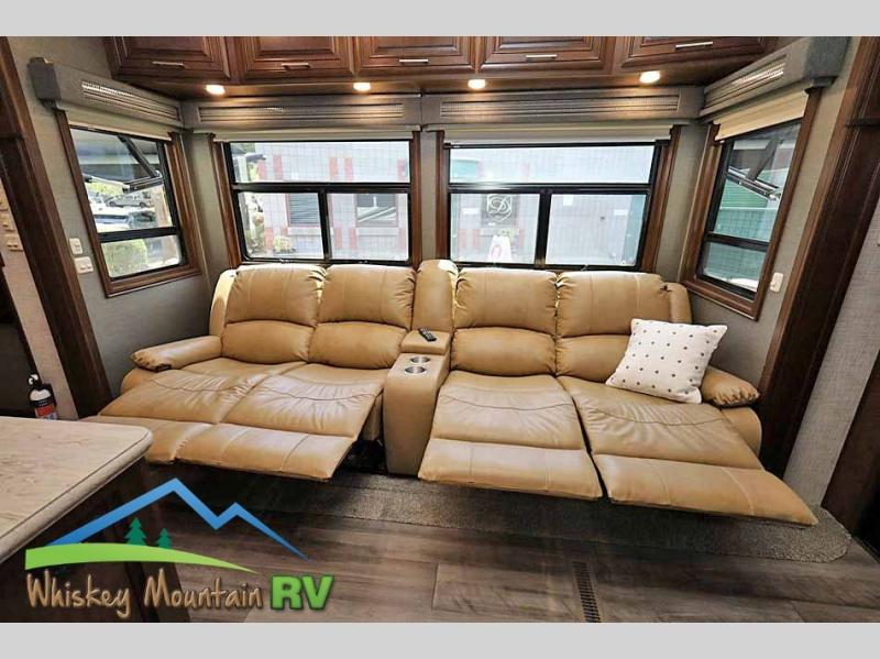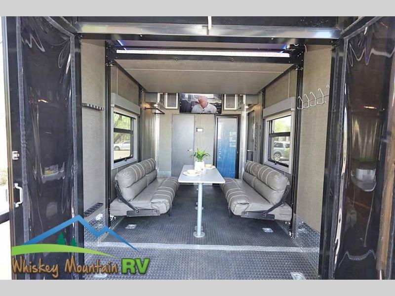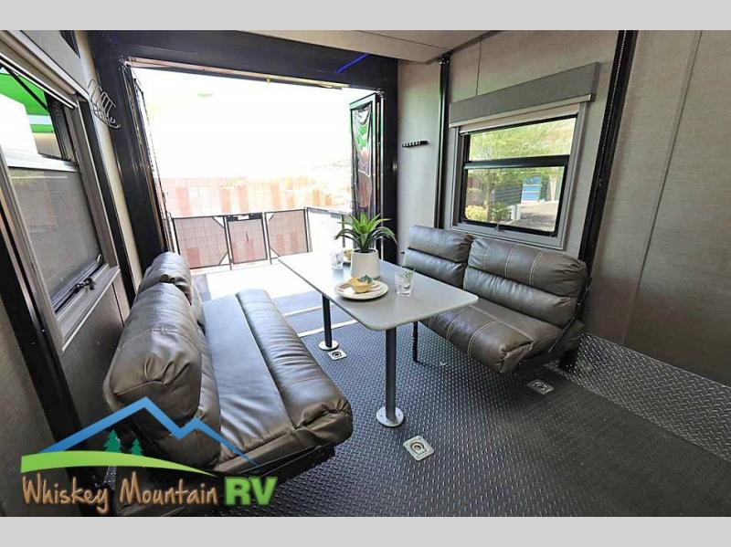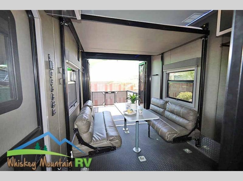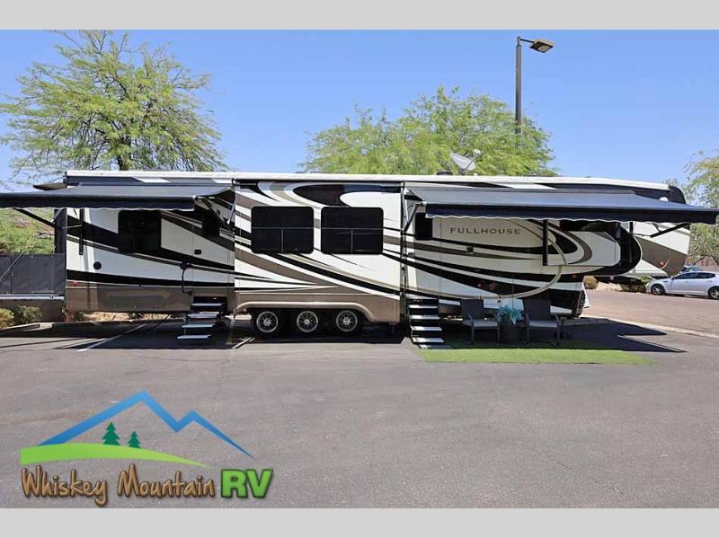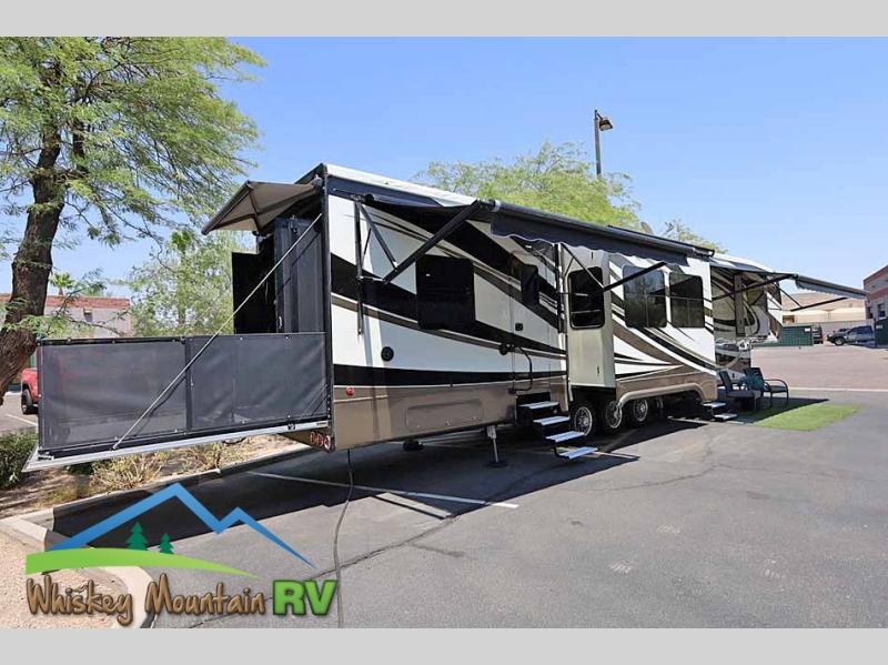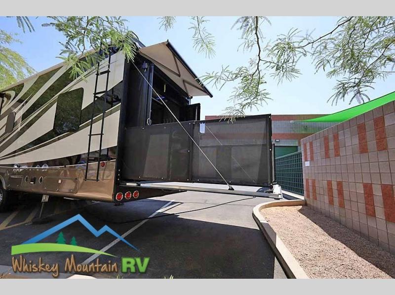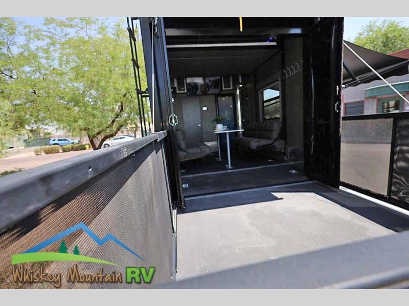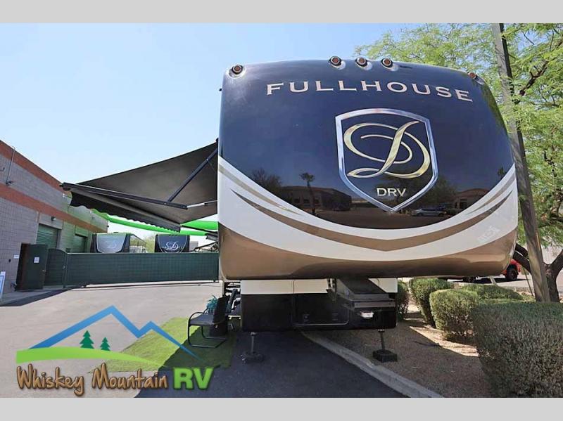 THIS 2019 DRV FULLHOUSE LX455 IS DRV'S BATH AND A HALF FLOOR PLAN WITH THE HALF BATH BEING LOCATED IN THE 12' GARAGE SPACE. THE GARAGE ITSELF HAS TWO POWERED BEDS, BIG TV AND THREE SEASON GARAGE PATIO SYSTEM WITH OUTSIDE PATIO AWNING. A STACKING WASHER / DRYER WAS ADDED AND THE 4 PIECE SOFA IS BRAND NEW.