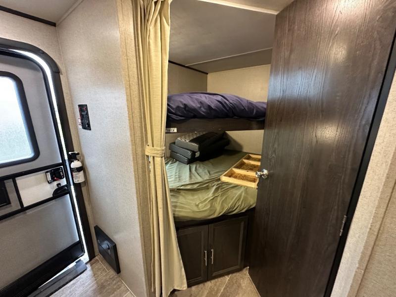 Grab seven of your closest friends, or your large family, and head out with this bunk model in tow! You will love that it easily sleeps between six and eight with a front private bedroom including a queen bed, and a set of double bed bunks in back. The U-shaped dinette can also be used for one or two more to sleep on, and with the large slide out a few friends might not mind grabbing floor space to be included in on the fun. The outdoor kitchen will make cooking for the whole gang super easy by adding two more cooktop burners, and it also allows you to spend as much time outdoors as possible with everything easily accessible. Head out today!
