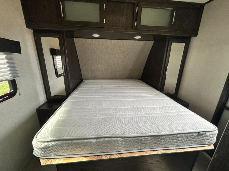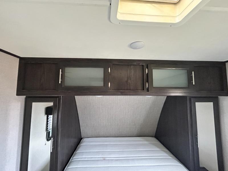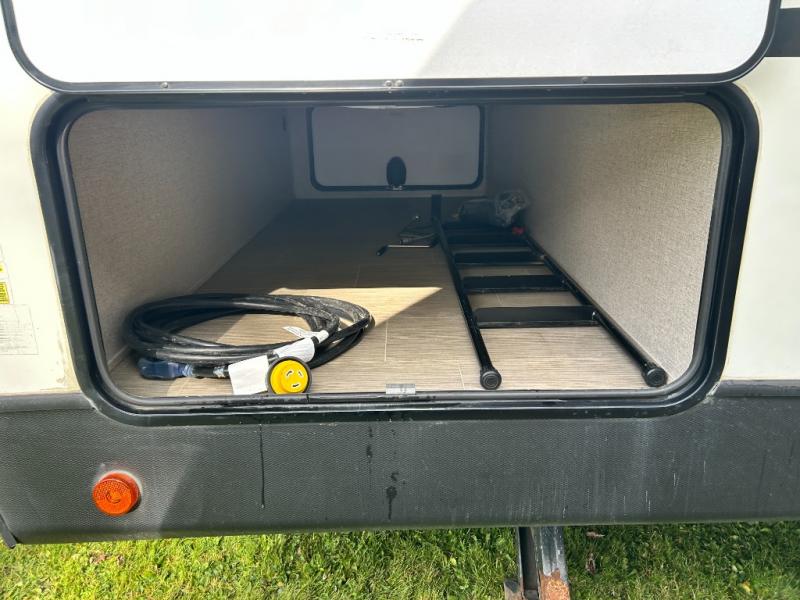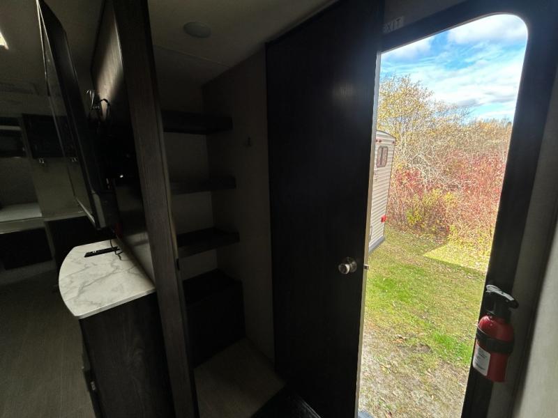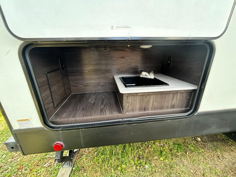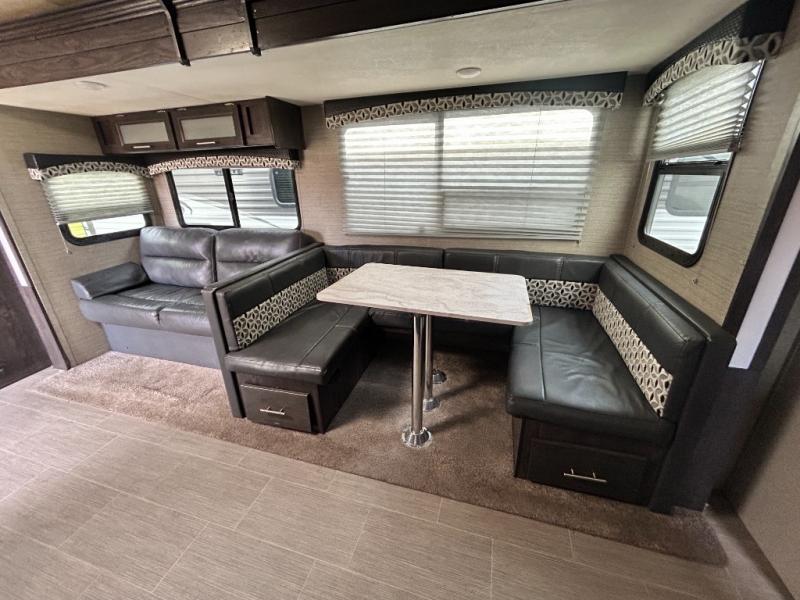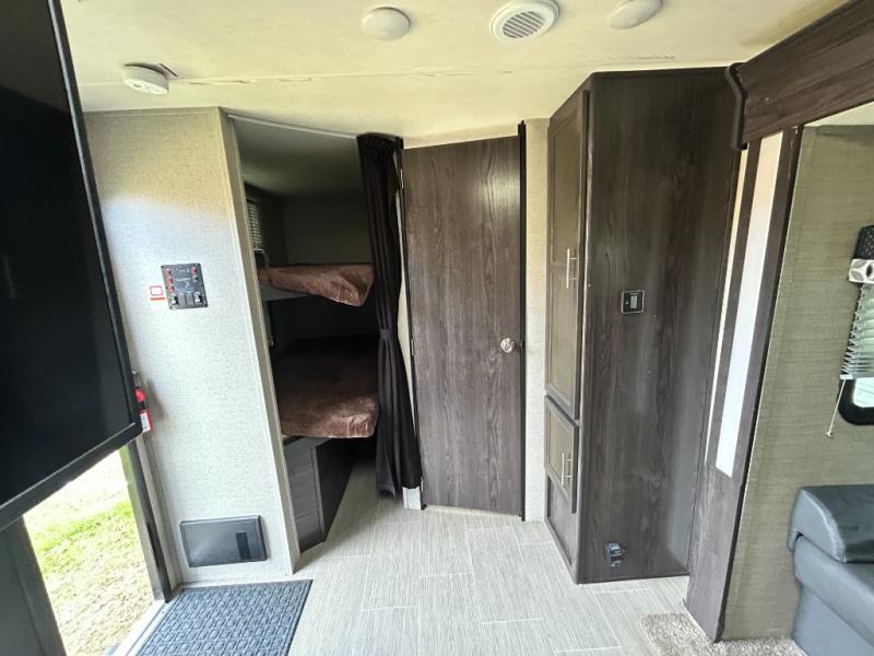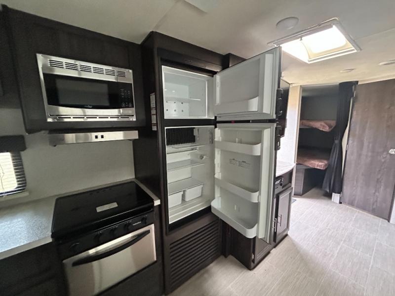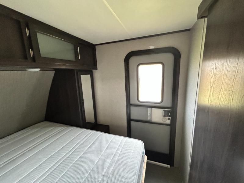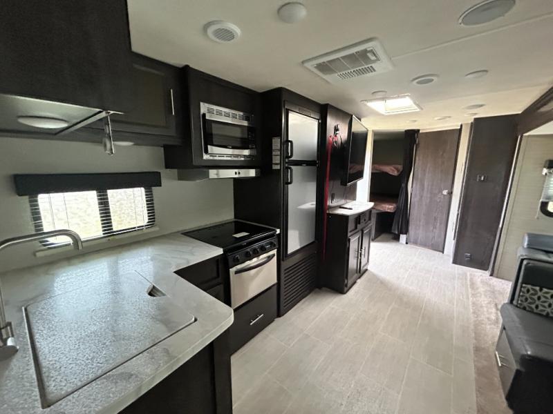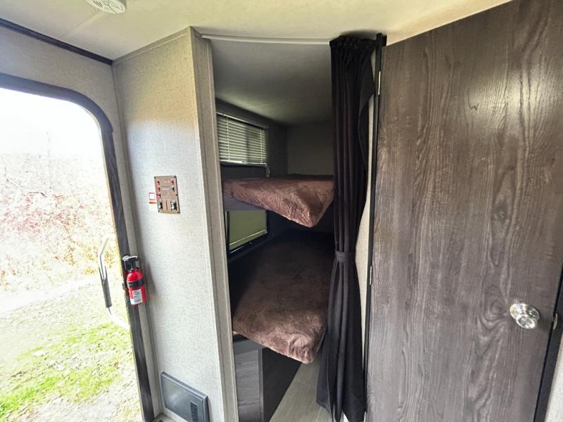 When you are ready to relax away from home with your family, this RV will provide you with a comfortable place to lay your head each night, like on the queen bed in the private bedroom with the second entry/exit door into the trailer. The kids can sleep on bunk beds next to the main entry and bathroom. After digging in the dirt, biking the trails, or fishing on the lake, you can get washed up before eating dinner at the U-shaped dinette. You even have the choice of cooking on the outdoor kitchen. The inside kitchen includes a walk-in pantry with shelves that will allow you to stock up on ingredients and snacks to last the entire trip. Take a look!