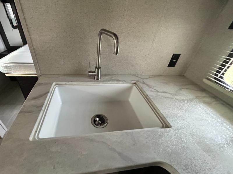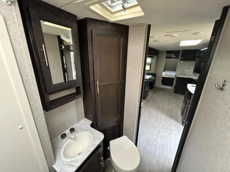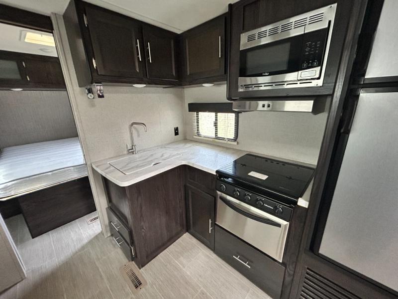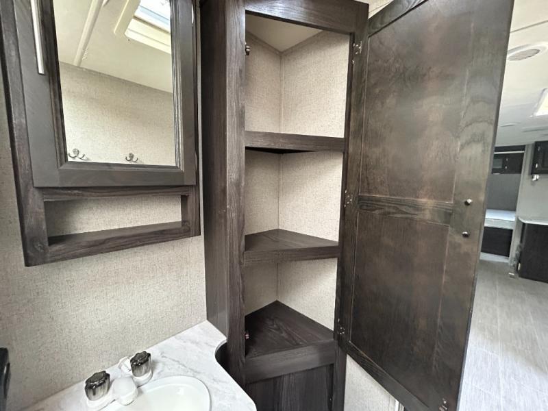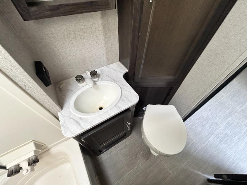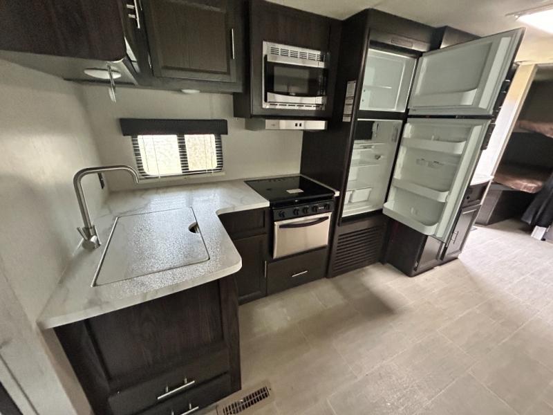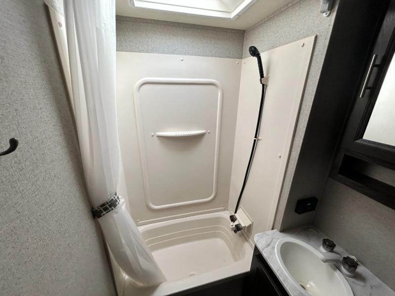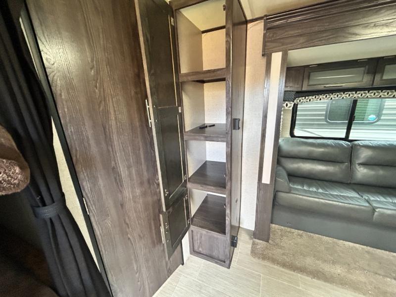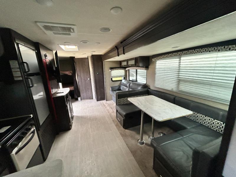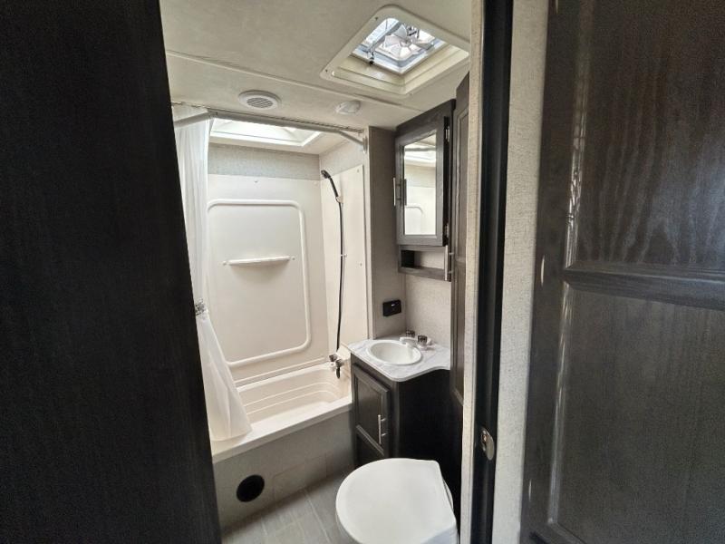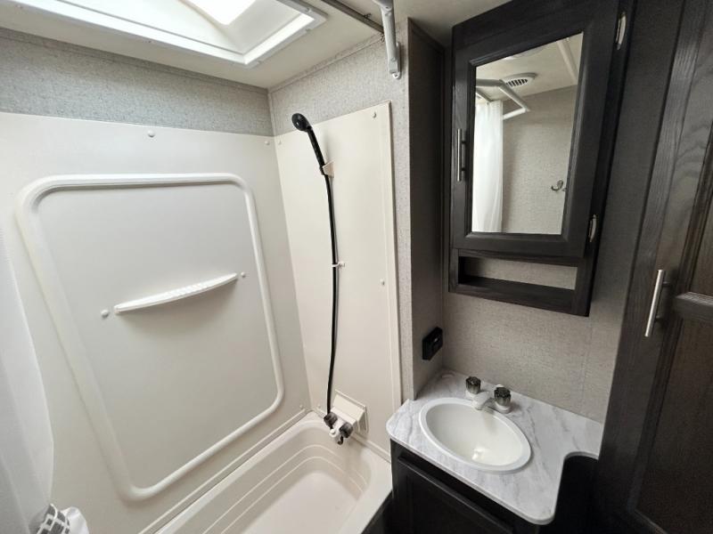 When you are ready to relax away from home with your family, this RV will provide you with a comfortable place to lay your head each night, like on the queen bed in the private bedroom with the second entry/exit door into the trailer. The kids can sleep on bunk beds next to the main entry and bathroom. After digging in the dirt, biking the trails, or fishing on the lake, you can get washed up before eating dinner at the U-shaped dinette. You even have the choice of cooking on the outdoor kitchen. The inside kitchen includes a walk-in pantry with shelves that will allow you to stock up on ingredients and snacks to last the entire trip. Take a look!