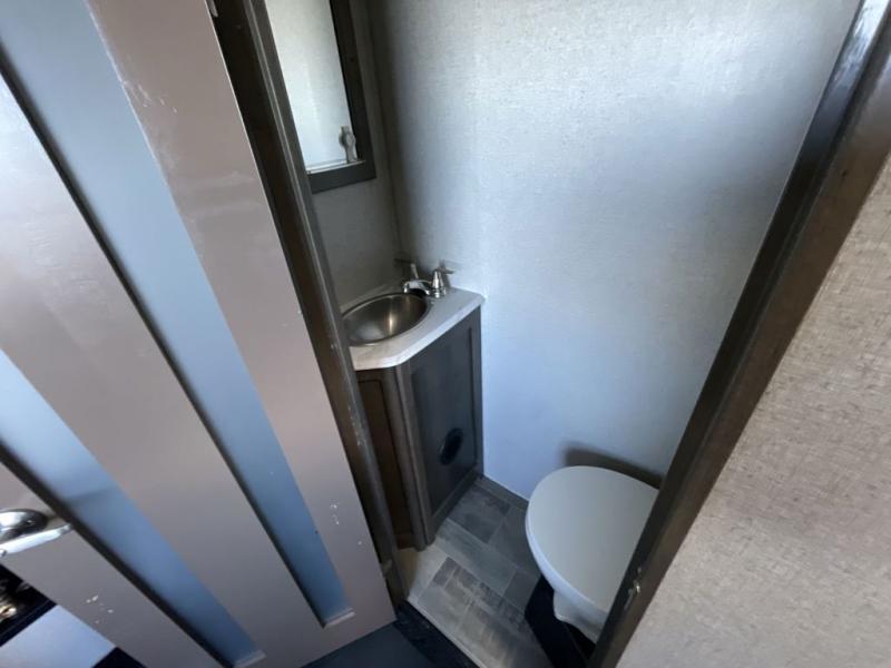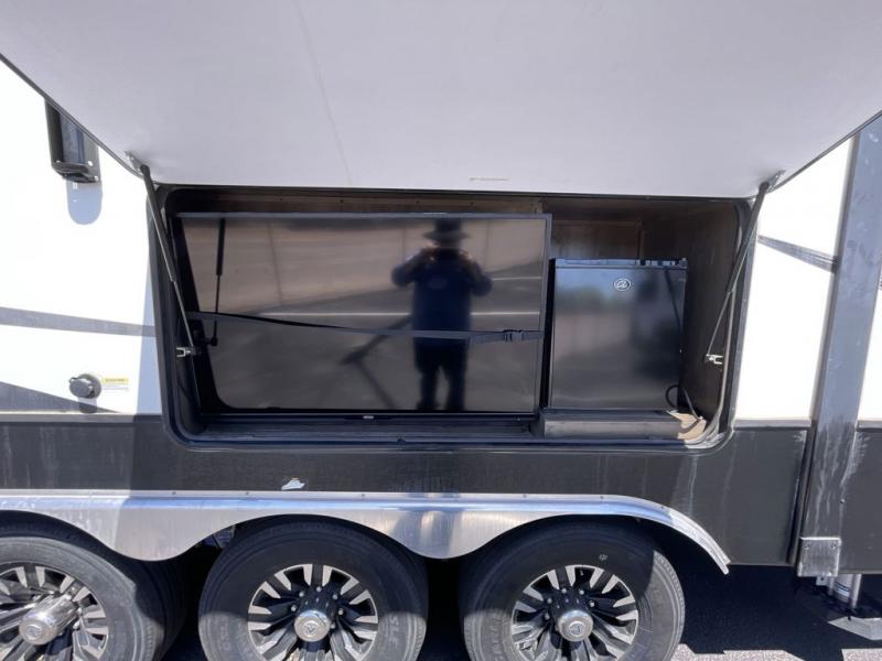 Head out for a fun-filled weekend with this Voltage toy hauler loaded and hitched up to your tow vehicle. With 13' of garage space that includes an overhead twin loft and a lay flat Happi-Jack power bunk with sofas and table top you will easily be able to take along a few friends! The private garage space even has its own half bath too so trail riders and adventure seekers of all kinds can easily access it when they need a bathroom break. When you are ready for some down time, you will enjoy the 46" TV and fireplace while you kick back on the sofa, or keep it all outdoors under the 21' main awning where you will find an outdoor entertainment center that you can enjoy even after the sun goes down.