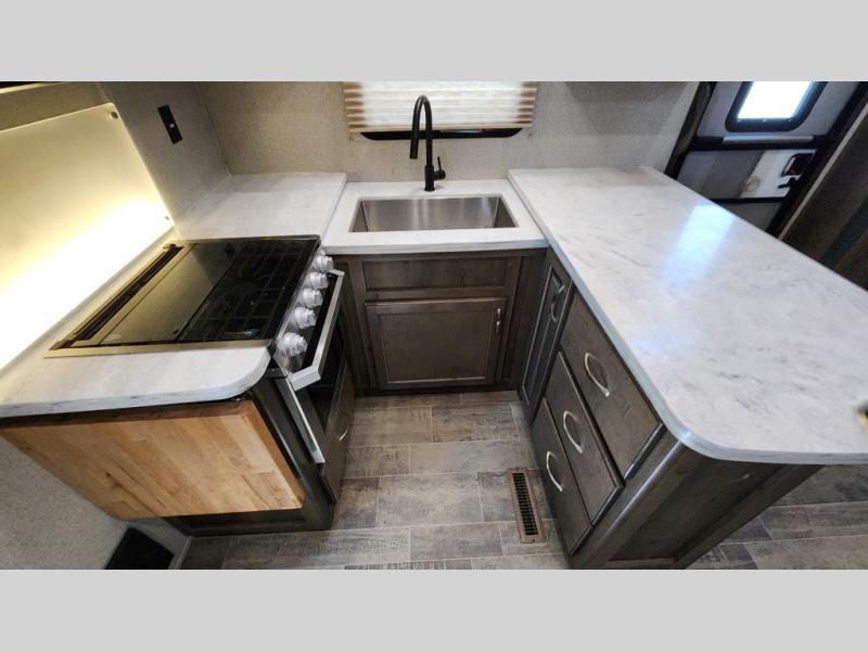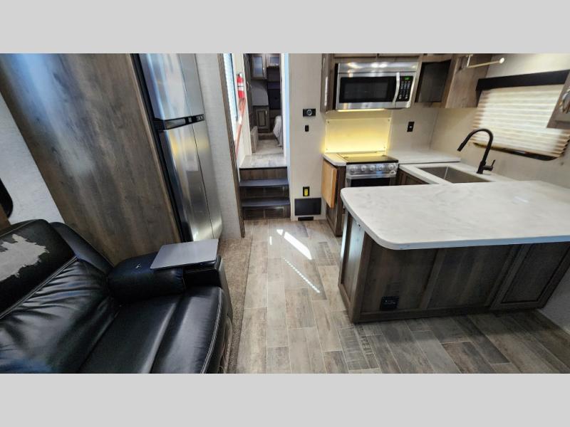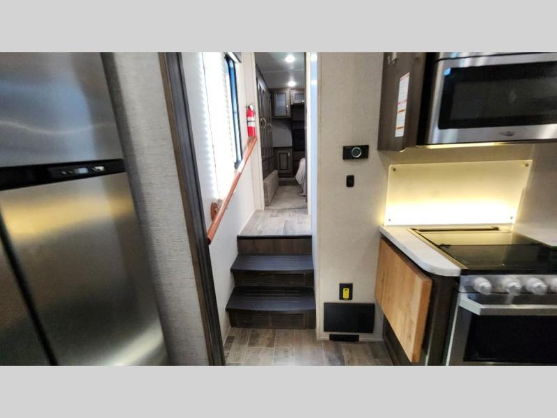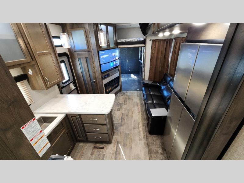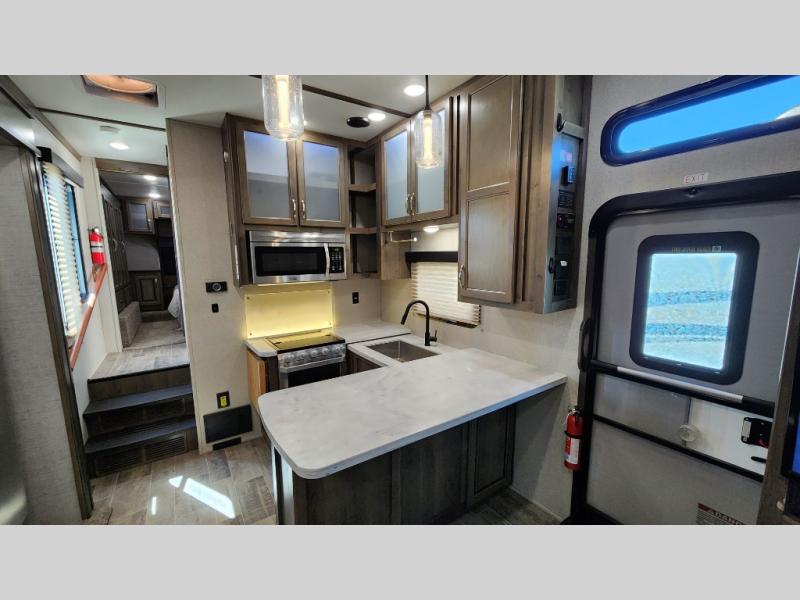 Even though the Dutchmen Voltage is the most popular fifth wheel toy hauler in its class, you don't have to own toys to want or own any one of these units. These haulers are so versatile that just having the added garage space allows you so many more camping options. Just think of how much gear you can take along for your favorite activities and outdoor games. Each rear ramp can be positioned horizontally for you to add optional awnings, screen rooms, and side rails to create a rear patio, or even a set of steps to the ground. On the inside, you will find that Voltage offers higher ceilings for a spacious open feel, residential furnishings, a gourmet kitchen with solid surface countertops, and hardwood cabinetry as well. And, with the 30 gallon gasoline fuel station, standard on every model, you can be sure that you can indeed bring all of the toys for the weekend and beyond! So, for camping that requires your favorite outdoor toys, or even a backyard patio, choose any Dutchmen Voltage FW toy hauler and begin planning your next family adventure!
