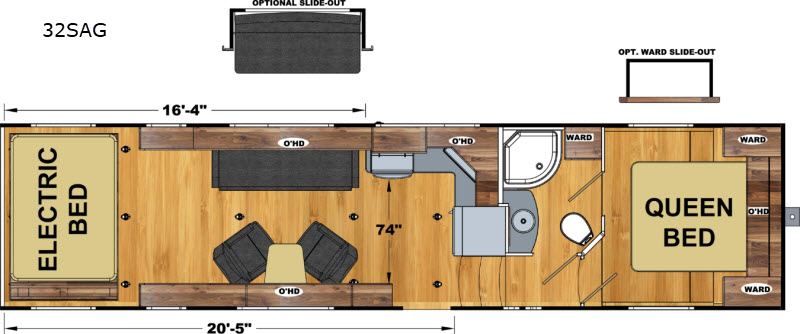 With 16'4" of roadside cargo space and 20'5" of curbside space you can easily load up your off-road toys and head out to the campground of your choice with this Attitude Wide Lite 32SAG toy hauler travel trailer. After your gear is unloaded then you can lower the electric bed. In the evening plan to sit for a while and visit at the sofa or the two lounge chairs. If you prefer a bit more floor space then you may want to add the optional slide out for the sofa. Meal prep is easy in this kitchen, and at night head up the stairs to the private front bedroom where you will find a queen bed and plenty of storage with the wardrobes and overhead cabinet, plus more!