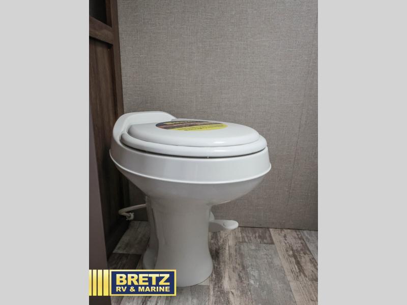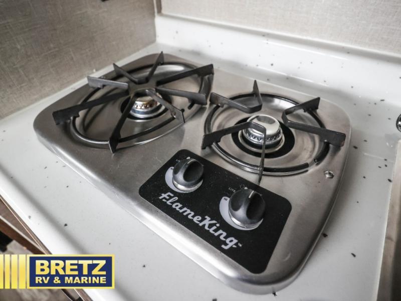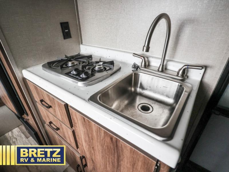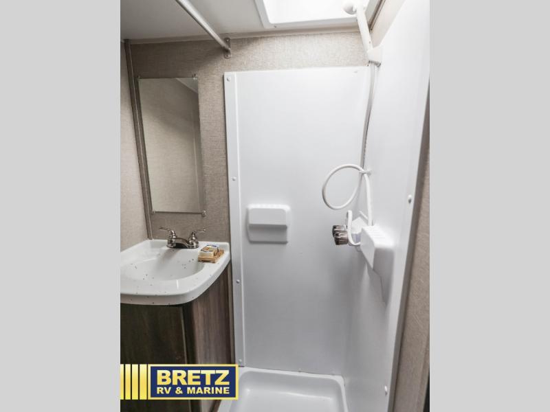 Bring the inside in through the slider windows and skylights! You can enjoy the natural lighting throughout when eating at the dinette table, taking a shower in the full bathroom, and napping on the double bed. The chef will enjoy making meals on the stovetop, storing dry goods in the pantry and cold items in the 3 cu. ft. refrigerator. If you have a few larger camping items, stow them away in the large pass-through storage outside. Big things do come in small packages, this trailer is proof!