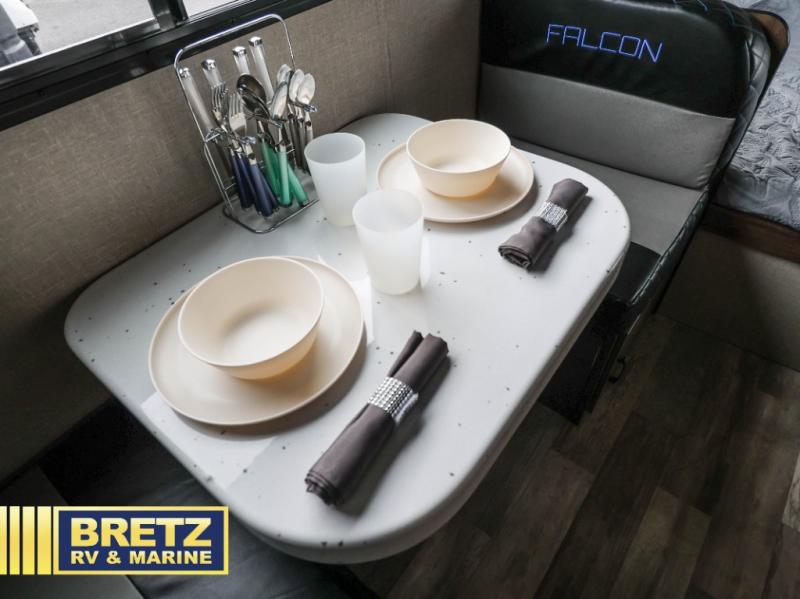 The Travel Lite Falcon F-Lite travel trailer is easy to tow behind most smaller SUVs, and easy to store after a fun weekend in the great outdoors. When it's time to camp, you don't have to leave your comforts of home behind with an interior that includes a refrigerator, a stovetop, ball bearing drawer guides, plus molded Granicote kitchen countertops and a dining table. And you will love the blue LED accent lighting at night. Choose the floorplan that works for you, and start traveling today!