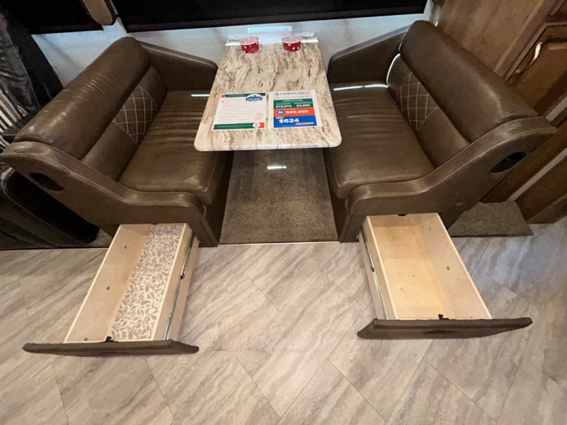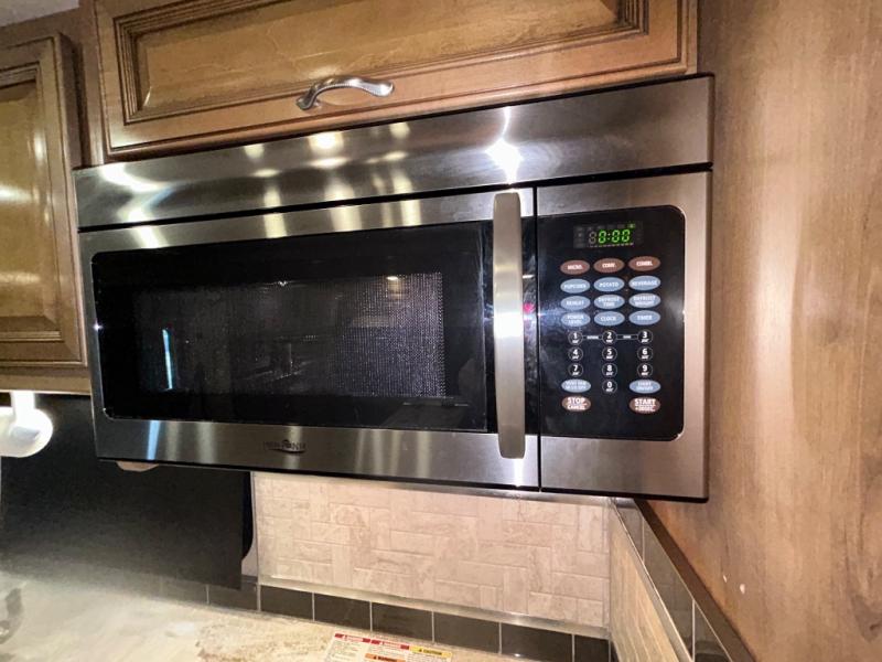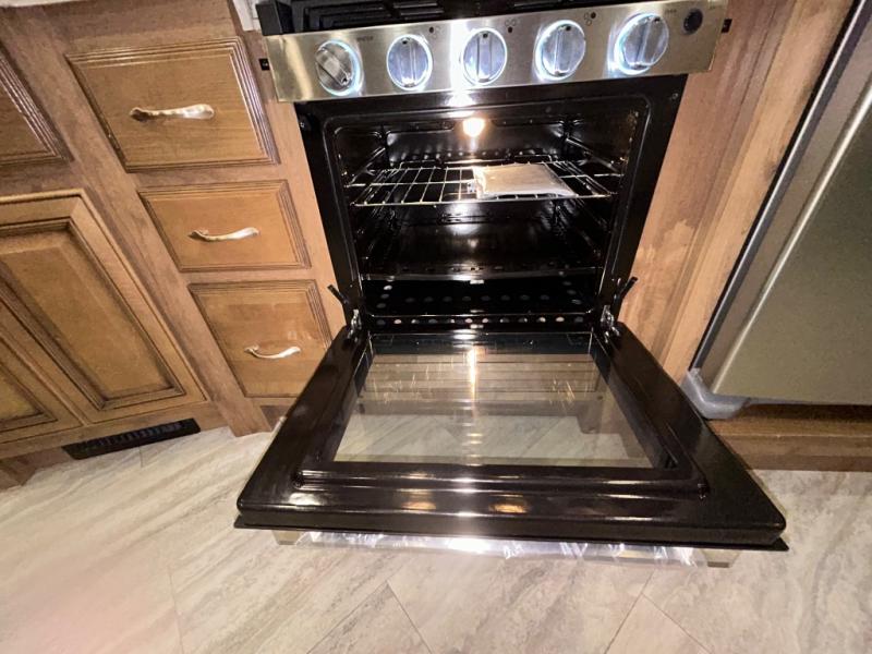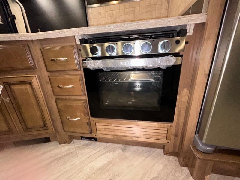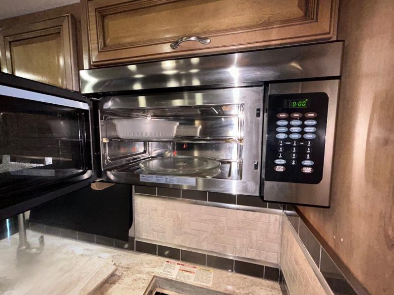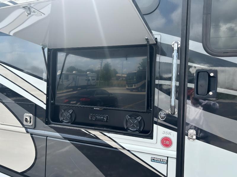 Every Fleetwood Bounder class A coach provides a comfortable and functional home on wheels. You will enjoy the drive as much as the stay with a reclining and swivel drivers chair with 6-way power control. The Bounder kitchen features stainless steel appliances, solid surface countertops, and a convection microwave oven. There is plenty of storage both inside and out, including a full pass through basement storage, so you can be sure to pack everything you might need. These units include a king memory foam mattress, plus a designer bedspread, headboard, pillow shams and pillows to give you that at-home comfort. Enjoy your evenings outdoors with a legless electric patio awning with LED lights, plus an exterior entertainment center with a 40" LED TV!