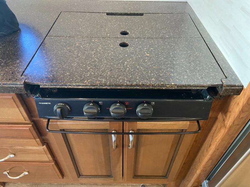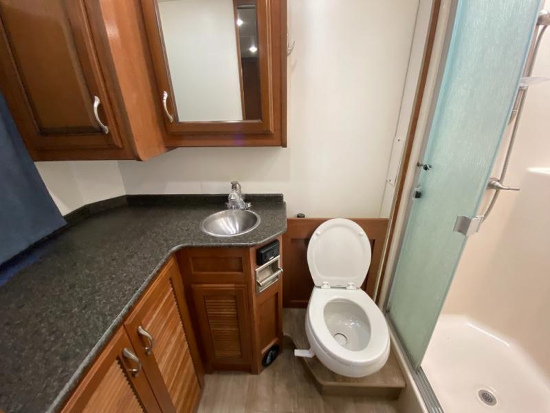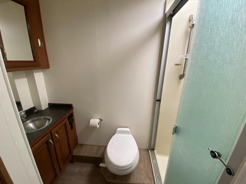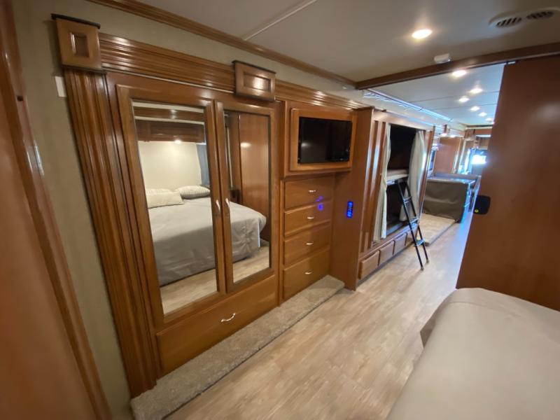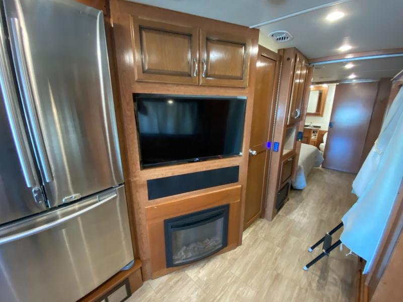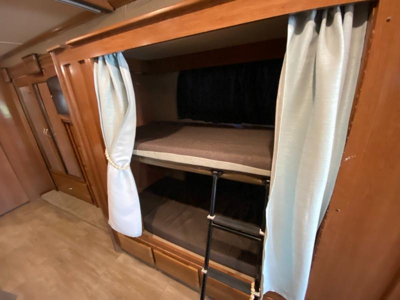 You will love this motorhome with a full wall slide that opens up the whole unit and provides added interior space. This unit features two full baths, each with a large shower with a seat, plus a shower skylight. The bunk beds are the perfect addition for those traveling with children. The 24" TV opposite of the bunks gives you the option to enjoy TV easily from the bunks or convert this area into a wardrobe and seating area for TV and gaming instead. Mom will love the kitchen with a residential refrigerator, ample counter space, plus a pantry/storage. This motorhome also includes a fireplace with a 40" TV, plus an exterior entertainment center with a 40" TV for all your viewing needs!