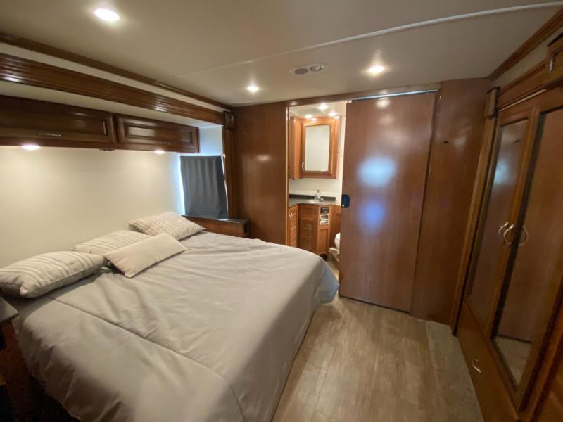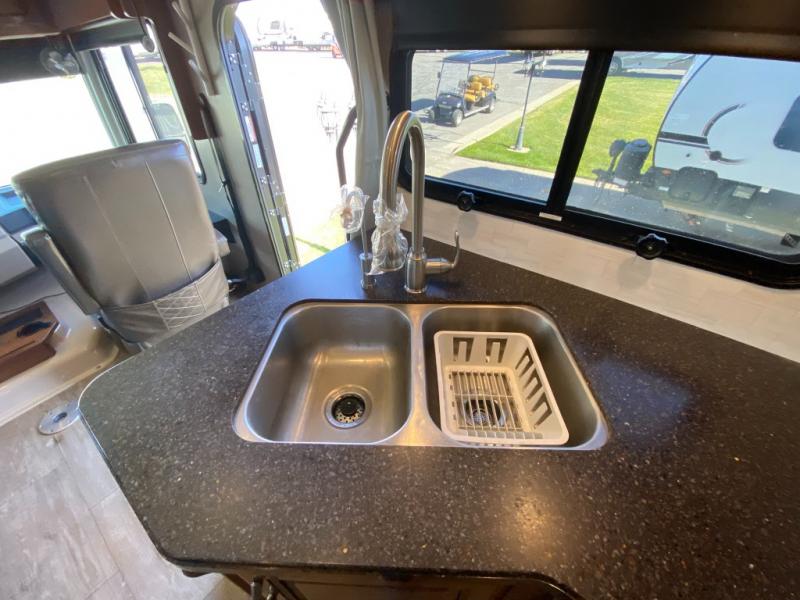 Every Fleetwood Bounder class A coach provides a comfortable and functional home on wheels. You will enjoy the drive as much as the stay with a reclining and swivel drivers chair with 6-way power control. The Bounder kitchen features stainless steel appliances, solid surface countertops, and a convection microwave oven. There is plenty of storage both inside and out, including a full pass through basement storage, so you can be sure to pack everything you might need. These units include a king memory foam mattress, plus a designer bedspread, headboard, pillow shams and pillows to give you that at-home comfort. Enjoy your evenings outdoors with a legless electric patio awning with LED lights, plus an exterior entertainment center with a 40" LED TV!