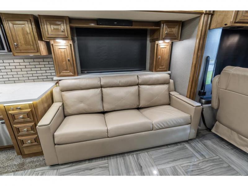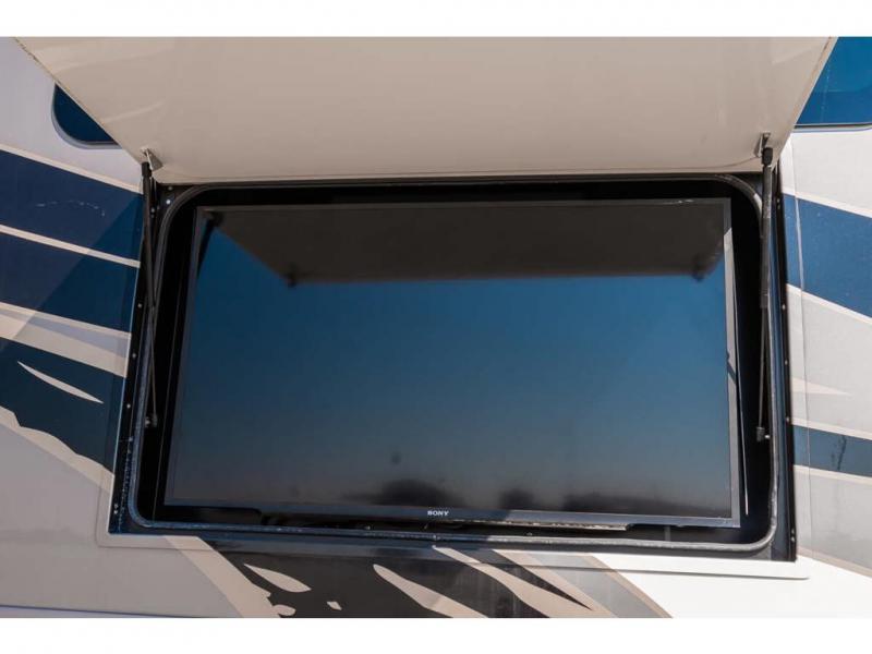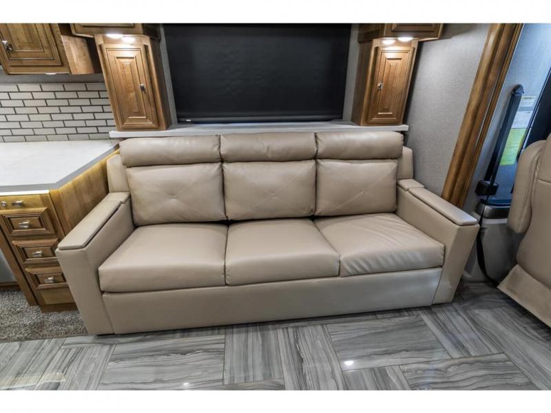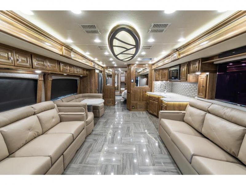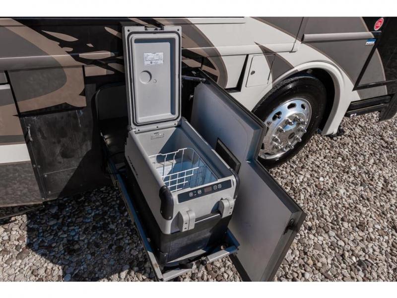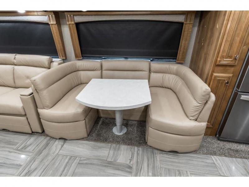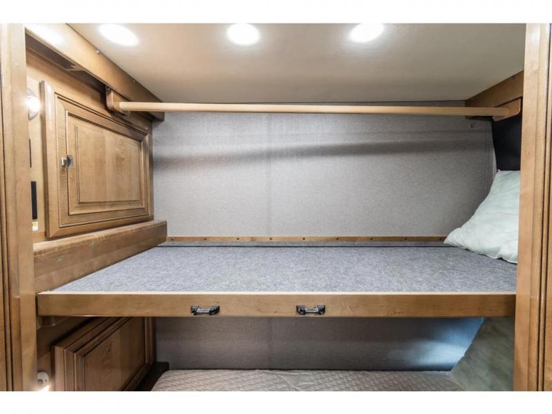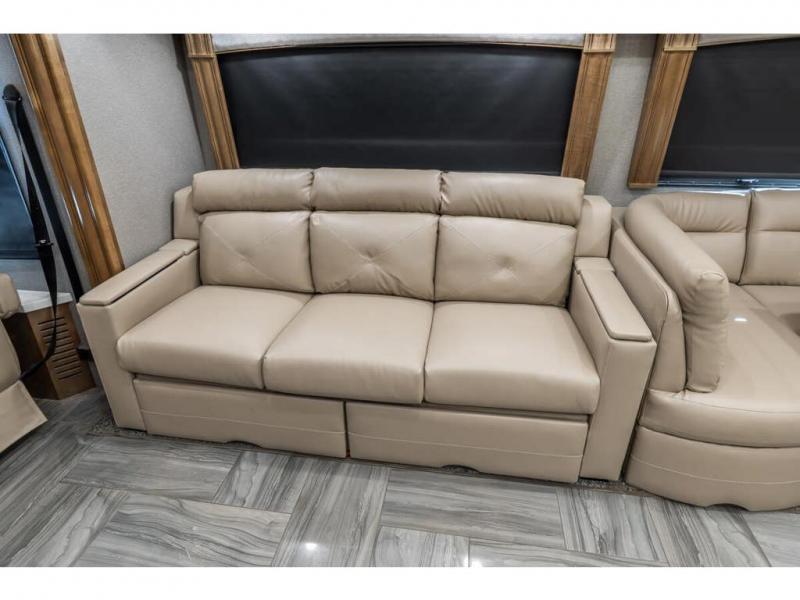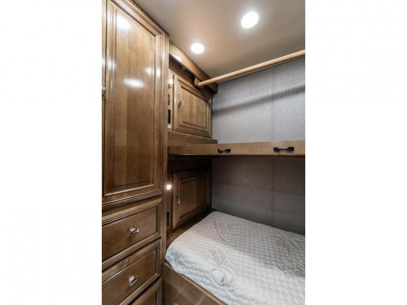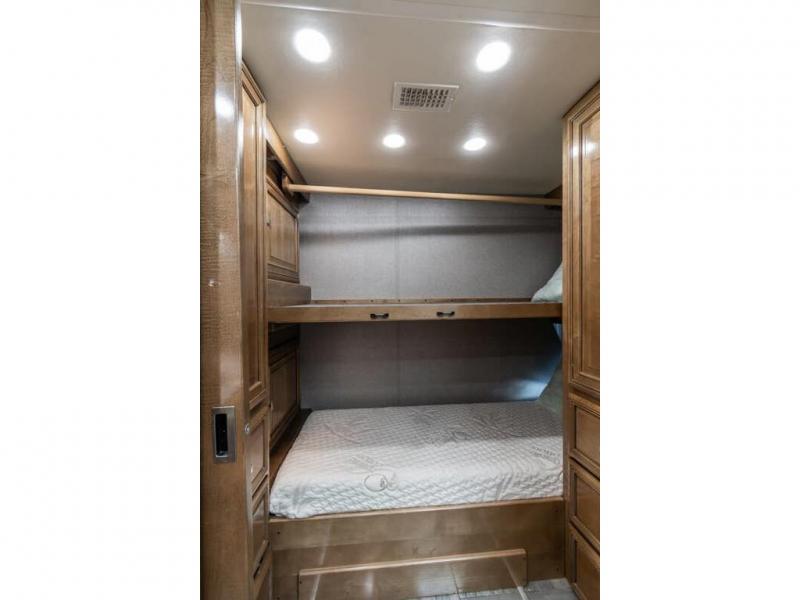 Imagine driving down the road on Ultra-Leather captain's chairs and furniture while enjoying the view out the windows of this diesel coach. Your grandkids are probably planning all their adventures once you get set up at the RV park. This unique layout offers bunk beds in the rear with wardrobe and linen storage as you walk through the master bedroom and full bathroom. You can enjoy your own Encore Series king bed while watching TV or even washing clothes in the side-by-side appliances. The half bath is conveniently mid-coach for those quick breaks, and there is plenty of furniture for relaxing, dining and extra sleeping space when the relatives join you. Don't forget about the outside 48" TV and electric awning when you want to enjoy the weather and watch the grandkids run around. You will find more features that provide luxury and convenience, step inside!