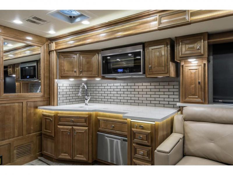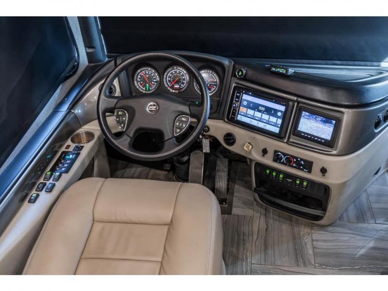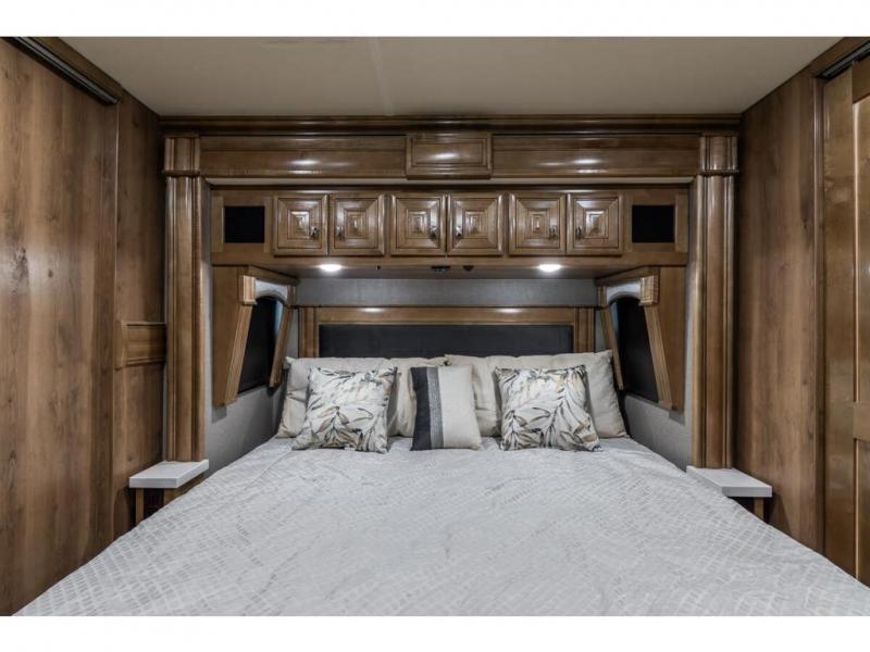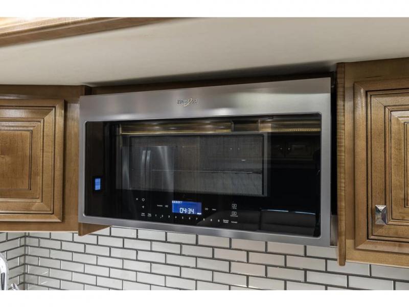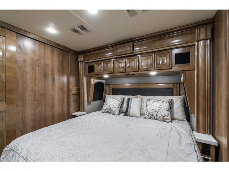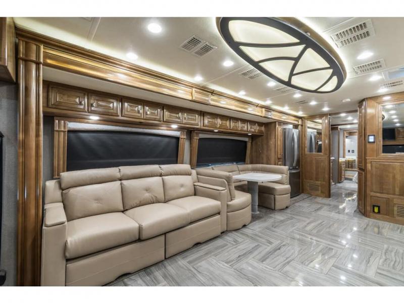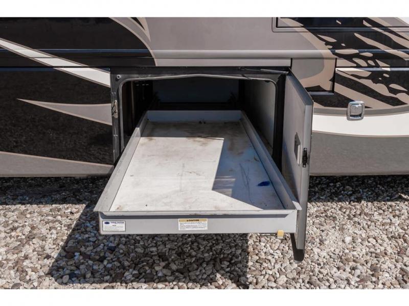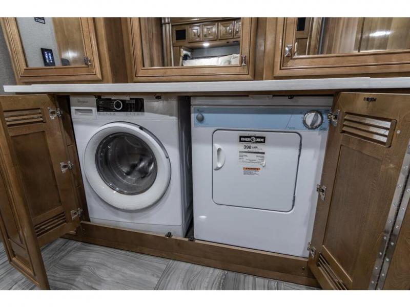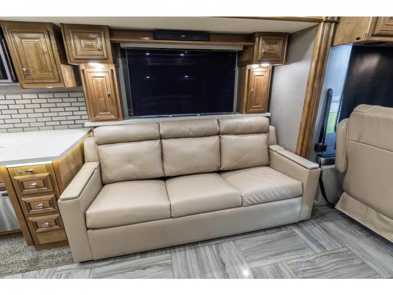 Imagine driving down the road on Ultra-Leather captain's chairs and furniture while enjoying the view out the windows of this diesel coach. Your grandkids are probably planning all their adventures once you get set up at the RV park. This unique layout offers bunk beds in the rear with wardrobe and linen storage as you walk through the master bedroom and full bathroom. You can enjoy your own Encore Series king bed while watching TV or even washing clothes in the side-by-side appliances. The half bath is conveniently mid-coach for those quick breaks, and there is plenty of furniture for relaxing, dining and extra sleeping space when the relatives join you. Don't forget about the outside 48" TV and electric awning when you want to enjoy the weather and watch the grandkids run around. You will find more features that provide luxury and convenience, step inside!