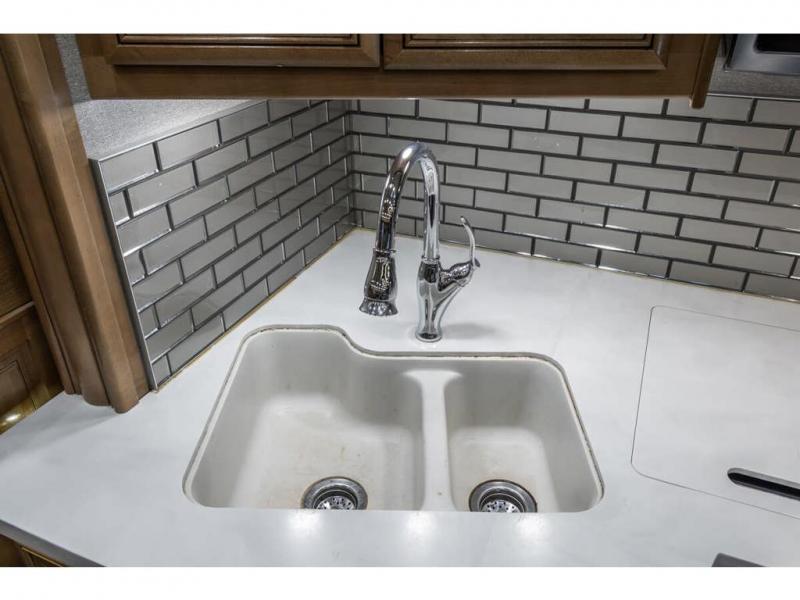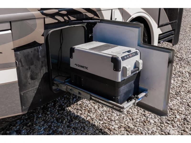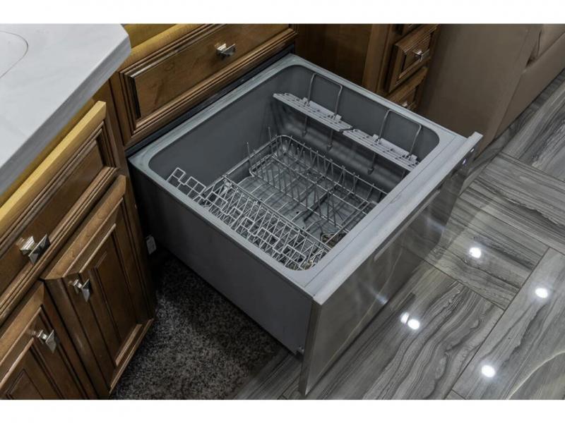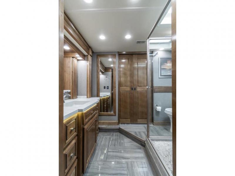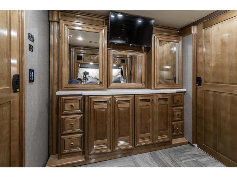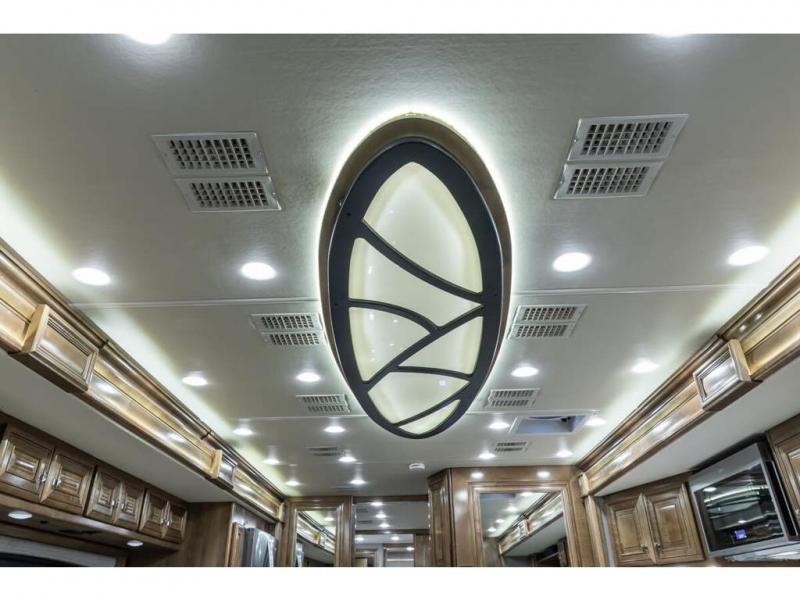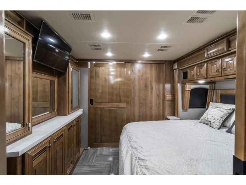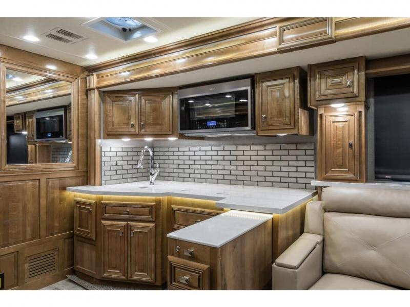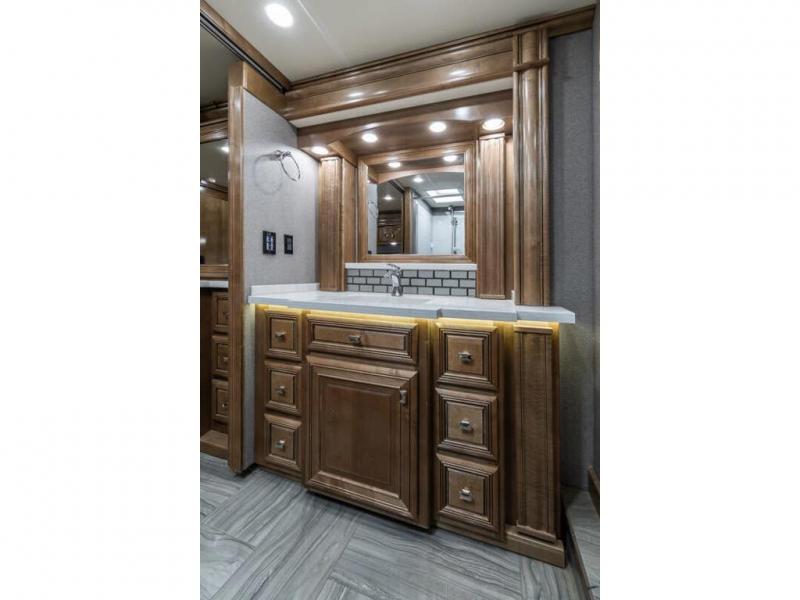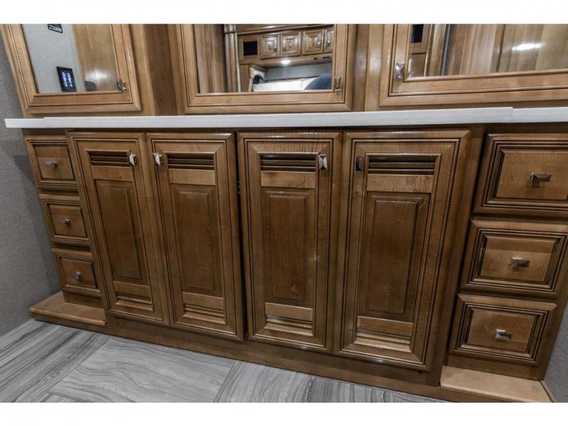 Imagine driving down the road on Ultra-Leather captain's chairs and furniture while enjoying the view out the windows of this diesel coach. Your grandkids are probably planning all their adventures once you get set up at the RV park. This unique layout offers bunk beds in the rear with wardrobe and linen storage as you walk through the master bedroom and full bathroom. You can enjoy your own Encore Series king bed while watching TV or even washing clothes in the side-by-side appliances. The half bath is conveniently mid-coach for those quick breaks, and there is plenty of furniture for relaxing, dining and extra sleeping space when the relatives join you. Don't forget about the outside 48" TV and electric awning when you want to enjoy the weather and watch the grandkids run around. You will find more features that provide luxury and convenience, step inside!