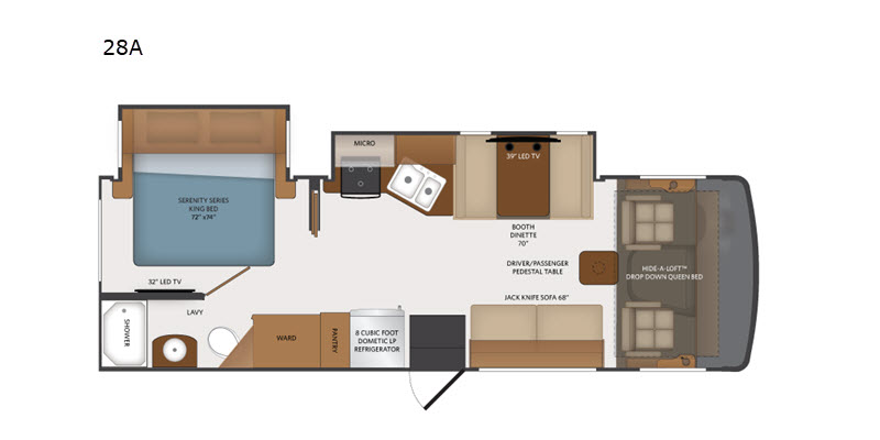 Whether your camping adventures take you near or far, you will want this Flair motorhome that can sleep seven to eight. Enjoy a cup of coffee every morning at the pedestal table by the driver and passenger seats. This unit features a rear bedroom with a Serenity Series king bed and a 32" TV to enjoy a movie with your spouse at night. The kids or the grandparents can comfortably sleep on the jack knife sofa, or the large booth dinette can be folded down for extra sleeping space, and don't forget the Hide-A-Loft drop down queen bed! Enjoy cooking in the kitchen with a three burner cooktop, and a microwave for quick meals. This model also includes an 8 cu.ft. refrigerator and a pantry to store food. Everyone will appreciate the rear corner bath that features a large shower skylight for natural light.