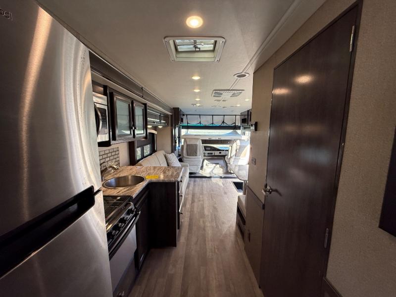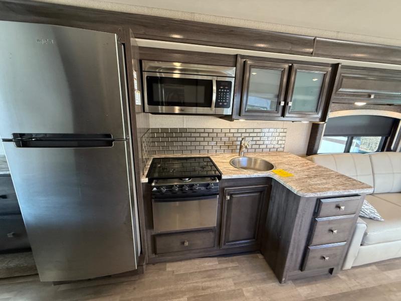 For a little rest and relaxation you will want this Flair motorhome to travel in. There is plenty of interior space thanks to the full wall slide that gives a more at-home feel. This model has seating space on the 74" jack knife sofa, plus you can enjoy family dinners at the 64" x 42" L-shaped dinette. After a long day of driving to your destination, turn in for the night in the rear bedroom that includes a Serenity Series king bed, a wardrobe, and a 32" TV. You will love being able to store food for the week with a residential refrigerator in this unit, plus plenty of counter space for meal prepping. This motorhome also features a true exterior kitchen for cooking outdoors and enjoying the mountain air!