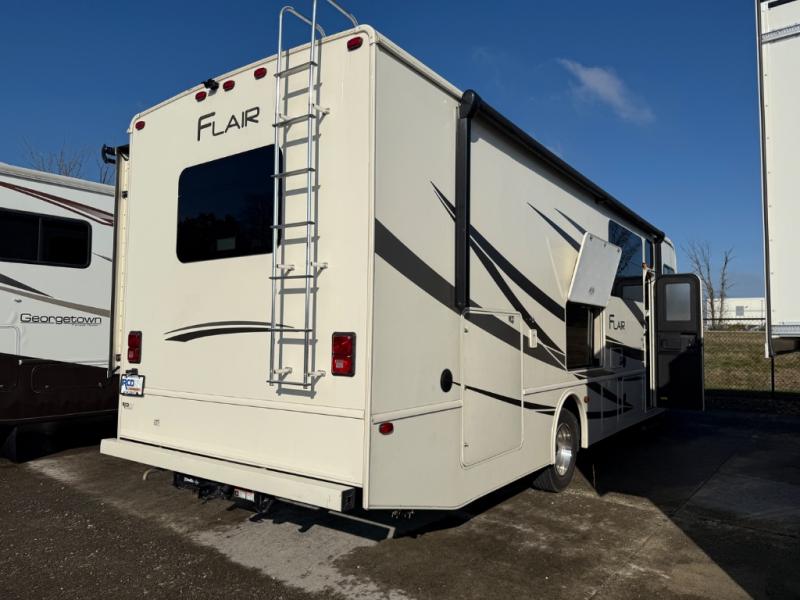 You will love the convenience and the functionality of the Fleetwood Flair. Each model includes a Hide-A-Loft drop down queen bed with a 600 lb. capacity, a residential sofa, and lino flooring. An over the range microwave, kitchen backsplash, and a residential single handle faucet with a pullout sprayer come standard in these motorhomes. In each unit you will be pleased to find a Bluetooth stereo system in the bedroom plus a USB port to charge your devices. Clean up after a day of hiking with family and friends with an exterior shower provided with each motorhome, plus you'll find a pass through storage to hold your larger items. These units have also been constructed with four point fully automatic hydraulic leveling jacks, a full coverage heavy duty undercoating, and a quiet, ducted A/C system. Come treat yourself with one of these Flair motorhomes by Fleetwood RV, you won't regret it!