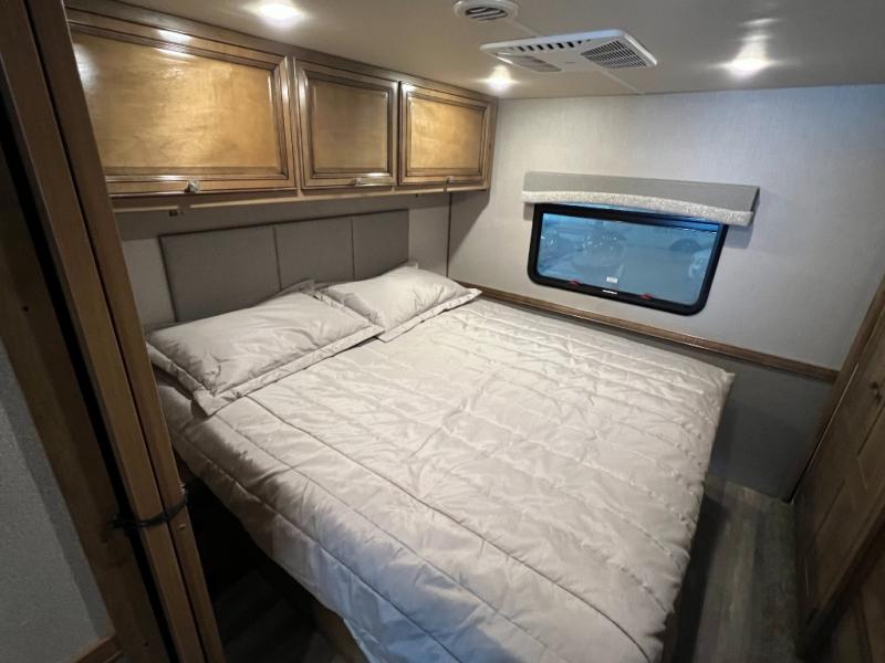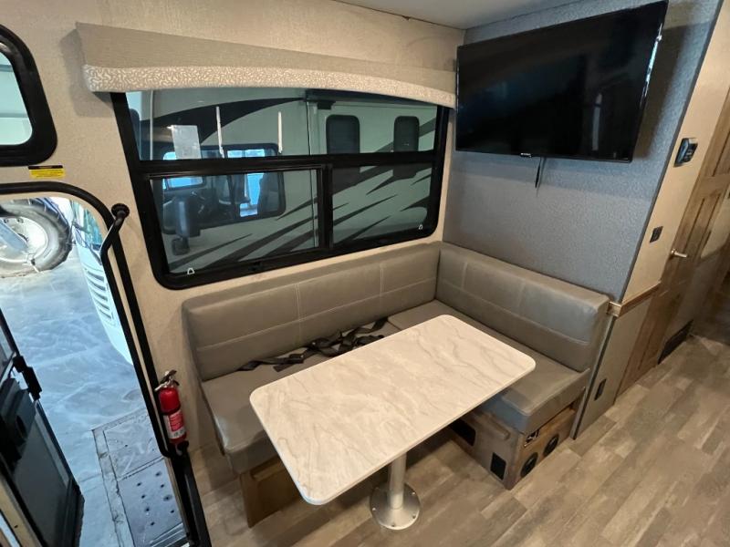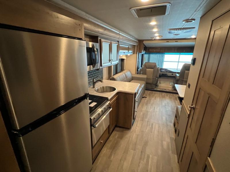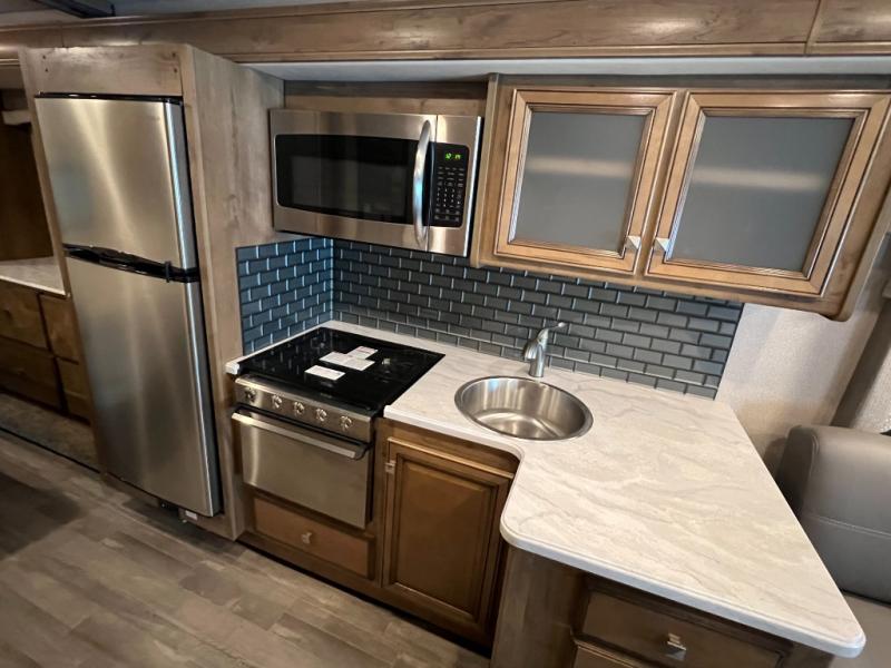 For a little rest and relaxation you will want this Flair motorhome to travel in. There is plenty of interior space thanks to the full wall slide that gives a more at-home feel. This model has seating space on the 74" jack knife sofa, plus you can enjoy family dinners at the 64" x 42" L-shaped dinette. After a long day of driving to your destination, turn in for the night in the rear bedroom that includes a Serenity Series king bed, a wardrobe, and a 32" TV. You will love being able to store food for the week with a residential refrigerator in this unit, plus plenty of counter space for meal prepping. This motorhome also features a true exterior kitchen for cooking outdoors and enjoying the mountain air!