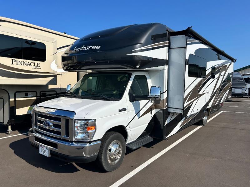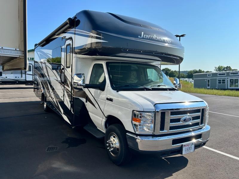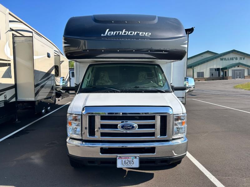 Just imagine driving down the road in comfortable captain's chairs to explore new places all while enjoying the smooth ride of this Jamboree class C gas coach. Once at your destination you can quickly set up the full wall slide to allow you plenty of room for the weekend or long vacation. You can cook with all the kitchen amenities, and store lots of food in the 11 cu. ft. residential refrigerator. And there is no need to use the public facilities with a full bathroom mid-coach. When you aren't relaxing outside watching the exterior 32" LED TV or sitting under the awning, you can visit at the L-shaped dinette or sofa. At night just imagine sleeping on a king bed while watching the bedroom TV. Your guests can sleep on the furniture or cabover bunk with their own TV. Take a look today!