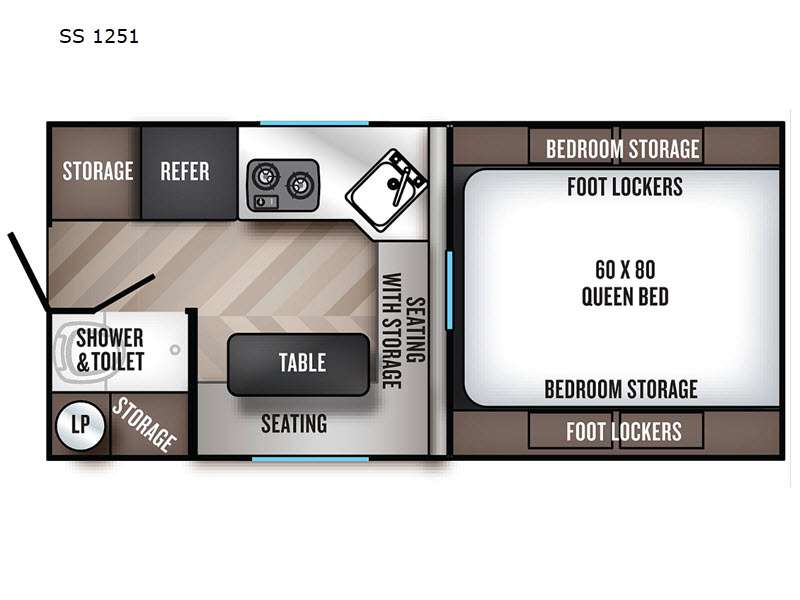 Pack your bags and load up this truck camper into your 1/2 ton truck with a 6' 6" bed with an overhang! There is plenty of storage throughout between the storage closet when you walk in, the storage in the wet bathroom, and the foot lockers and bedroom storage on either side of the queen bed. You can prepare your best home cooked meals with the two burner cooktop and enjoy them at the seating area with storage which is also a great place for playing card games!